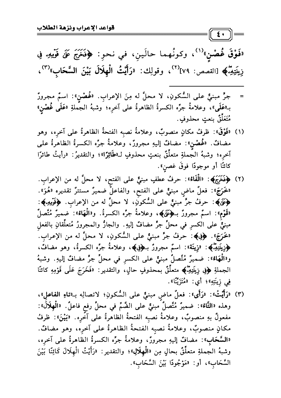«فَوْقَ غُصْنٍ» (¬١)، وكونُهما حالَينِ، في نحوِ: {فخرج على قومه في زينته} [القصص: ٧٩] (¬٢)، وقولِك: «رَأَيْتُ الْهِلَالَ بَيْنَ السَّحَابِ» (¬٣)،