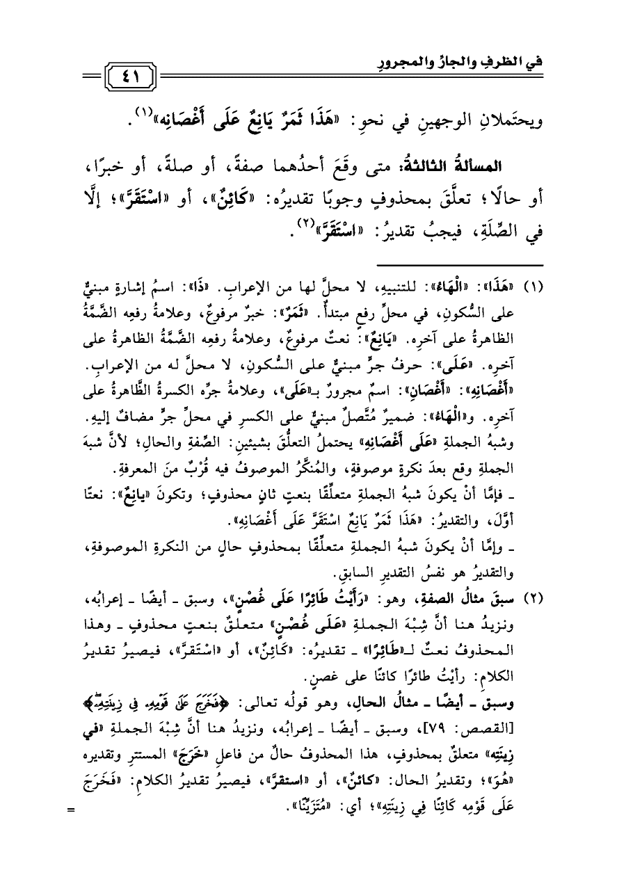 (¬٢) سبقَ مثالُ الصفةِ، وهو: «رَأَيْتُ طَائِرًا عَلَى غُصْنٍ»، وسبق -أيضًا- إعرابُه، ونزيدُ هنا أنَّ شِبْهَ الجملةِ «عَلَى غُصْنٍ» متعلقٌ بنعتٍ محذوفٍ -وهذا المحذوفُ نعتٌ لـ «طَائِرًا» - تقديرُه: «كَائِنٌ»، أو «اسْتَقرَّ»، فيصيرُ تقديرُ الكلامِ: رأيْتُ طائرًا كائنًا على غصنٍ.
