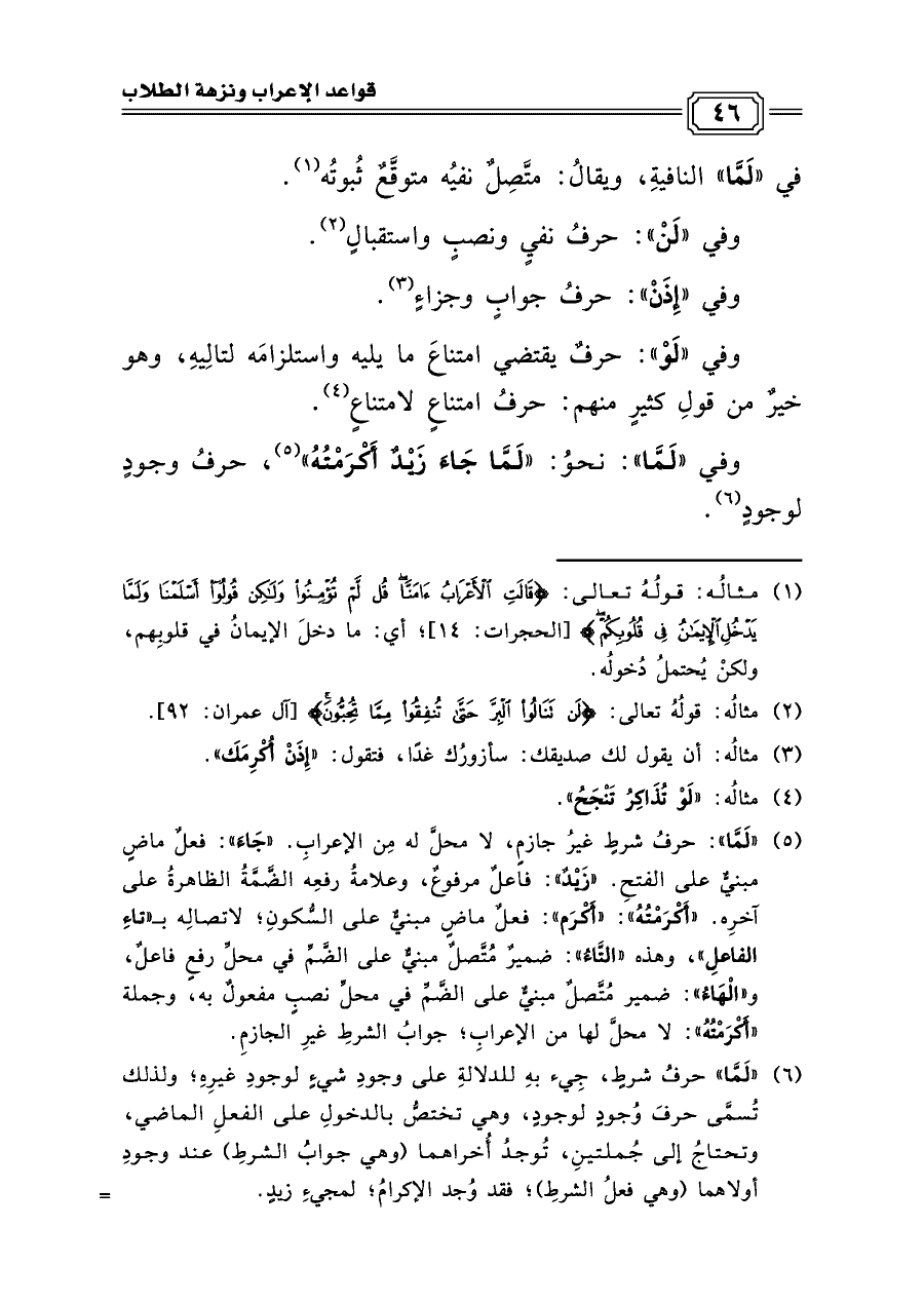 (¬٦) «لَمَّا» حرفُ شرطٍ، جِيء بهِ للدلالةِ على وجودِ شيءٍ لوجودِ غيرِهِ؛ ولذلك تُسمَّى حرفَ وُجودٍ لوجودٍ، وهي تختصُّ بالدخولِ على الفعلِ الماضي، وتحتاجُ إلى جُملتينِ، تُوجدُ أُخراهما (وهي جوابُ الشرطِ) عند وجودِ أولاهما (وهي فعلُ الشرطِ)؛ فقد وُجد الإكرامُ؛ لمجيءِ زيدٍ.