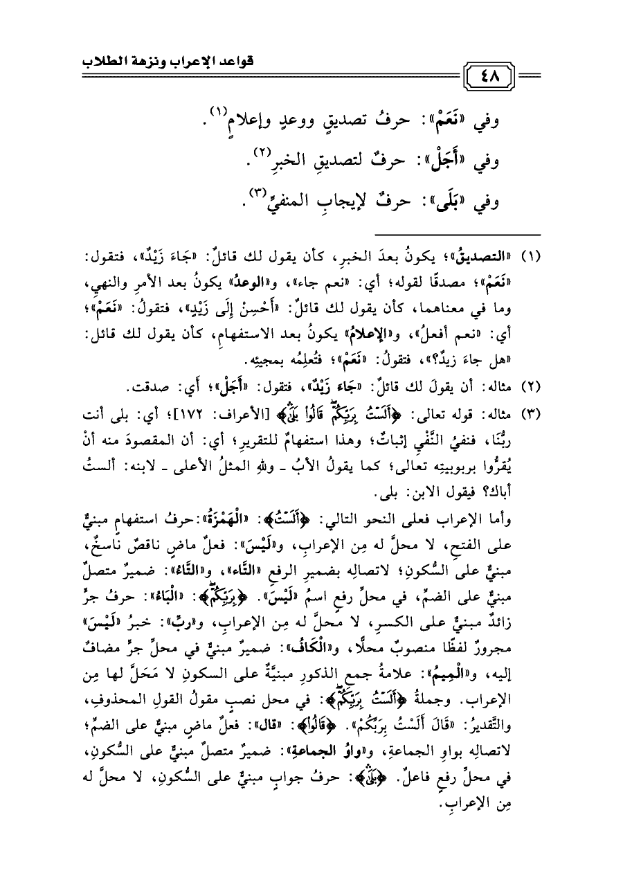(¬١) «التصديقُ»؛ يكونُ بعدَ الخبرِ، كأن يقول لك قائلٌ: «جَاءَ زَيْدٌ»، فتقول: «نَعَمْ»؛ مصدقًا لقوله، أي: «نعم جاء»، و «الوعدُ» يكونُ بعد الأمرِ والنهيِ، وما في معناهما، كأن يقول لك قائلٌ: «أَحْسِنْ إِلَى زَيْدٍ»، فتقولُ: «نَعَمْ»، أي: «نعم أفعلُ»، و «الإعلامُ» يكونُ بعد الاستفهامِ، كأن يقول لك قائل: «هل جاءَ زيدٌ؟»، فتقولُ: «نَعَمْ»؛ فتُعلِمُه بمجيئِه.