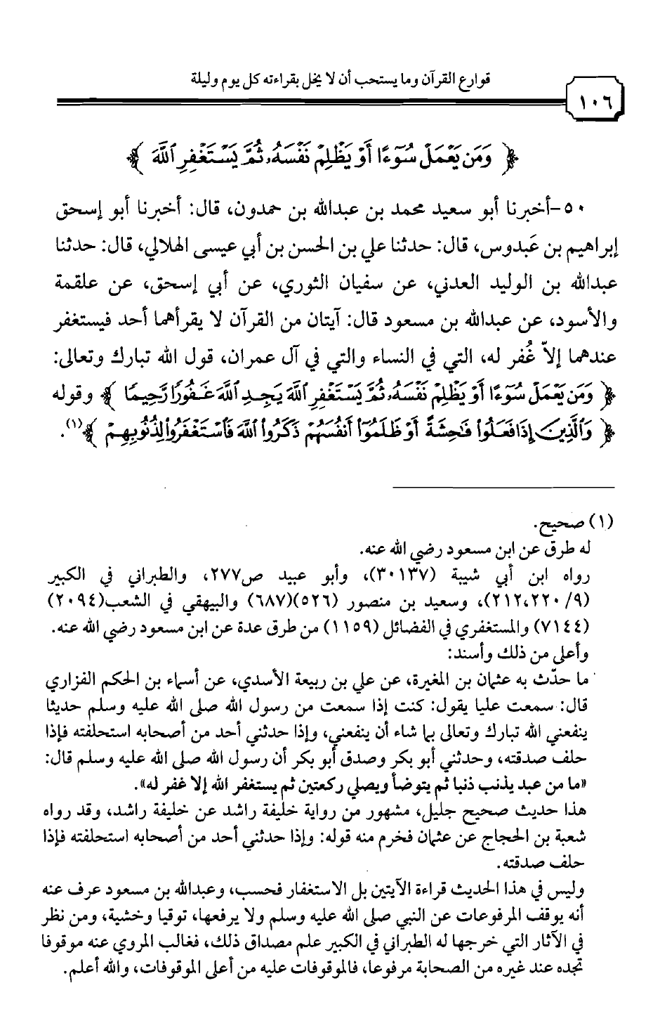 50 - أخبرنا أبو سعيد محمد بن عبد الله بن حمدون، قال: أخبرنا أبو إسحاق إبراهيم بن عبدوس، قال: حدثنا علي بن الحسن بن أبي عيسى الهلالي، قال: حدثنا عبد الله بن الوليد العدني، عن سفيان الثوري، عن أبي إسحاق، عن علقمة والأسود، عن عبد الله بن مسعود قال: آيتان من القرآن لا يقرأهما أحد فيستغفر عندهما إلا غفر له، التي في النساء والتي في آل عمران، قول الله تبارك وتعالى: {ومن يعمل سوءا أو يظلم نفسه ثم يستغفر الله يجد الله غفورا رحميا} وقوله {والذين إذا فعلوا فاحشة أو ظلموا أنفسهم ذكروا الله فاستغفروا لذنوبهم}.