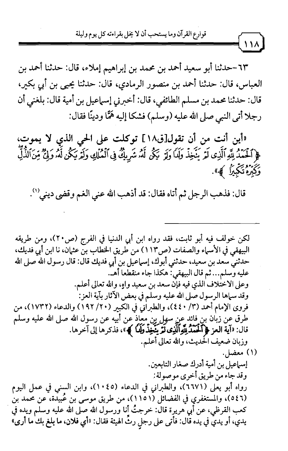63 - حدثنا أبو سعيد أحمد بن محمد بن إبراهيم إملاء، قال: حدثنا أحمد بن العباس، قال: حدثنا أحمد بن منصور الرمادي، قال: حدثنا يحيى بن أبي بكير، قال: حدثنا محمد بن مسلم الطائفي، قال: أخبرني إسماعيل بن أمية قال: بلغني أن رجلا أتى النبي صلى الله عليه وسلم فشكا إليه هما ودينا فقال: