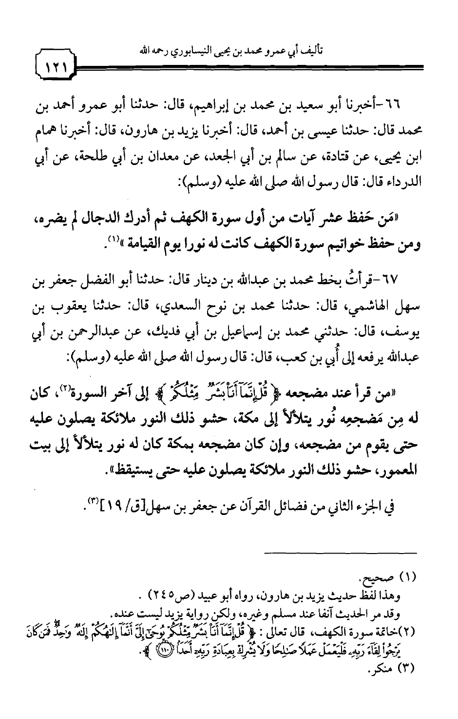 67 - قرأت بخط محمد بن عبد الله بن دينار قال: حدثنا أبو الفضل جعفر بن سهل الهاشمي، قال: حدثنا محمد بن نوح السعدي، قال: حدثنا يعقوب بن يوسف، قال: حدثني محمد بن إسماعيل بن أبي فديك، عن عبد الرحمن بن أبي عبد الله يرفعه إلى أبي بن كعب، قال: قال رسول الله صلى الله عليه وسلم: