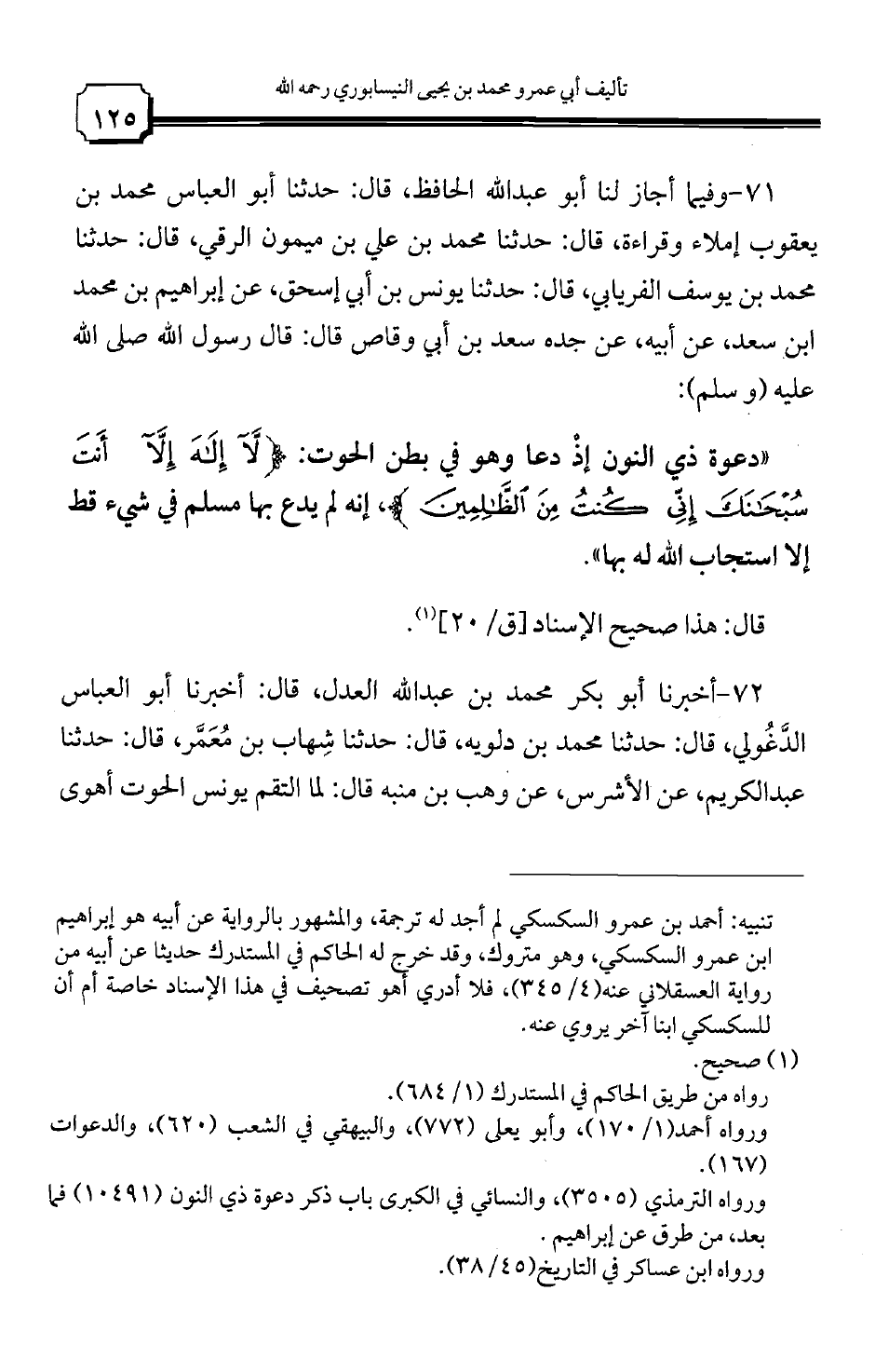 "دعوة ذي النون إذ دعا وهو في بطن الحوت {لا إله إلا أنت سبحانك إني كنت من الظالمين}، إنه لم يدع بها مسلم في شيء قط إلا استجاب الله له بها".