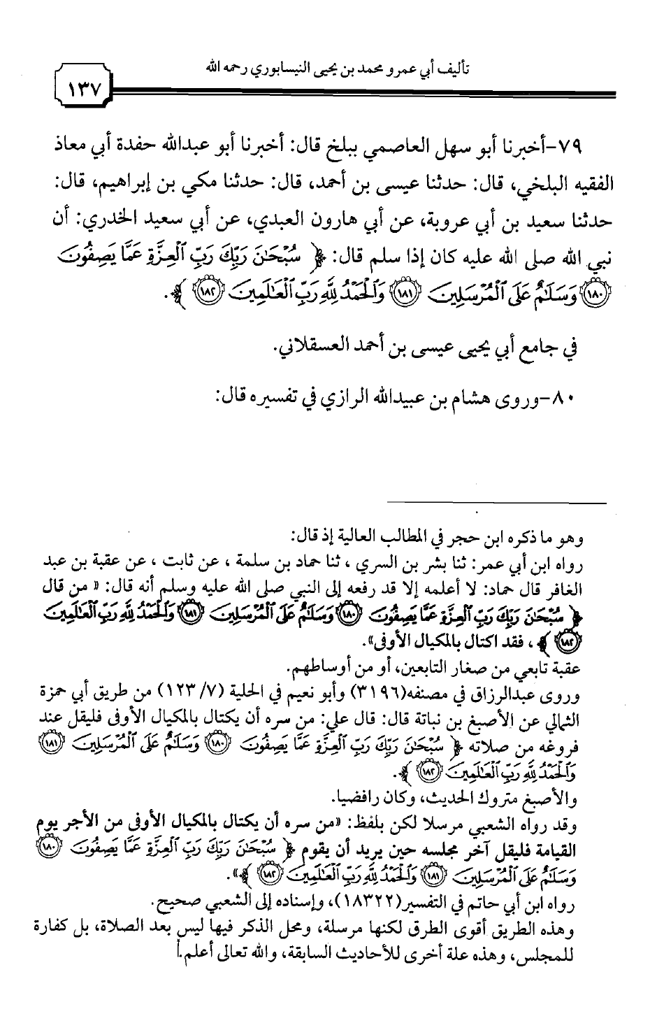 79 - أخبرنا أبو سهل العاصمي ببلخ قال: أخبرنا أبو عبد الله حفدة أبي معاذ الفقيه البلخي، قال: حدثنا عيسى بن أحمد، قال: حدثنا مكي بن إبراهيم، قال: حدثنا سعيد بن أبي عروبة، عن أبي هارون العبدي، عن أبي سعيد الخدري: أن نبي الله صلى الله عليه كان إذا سلم قال: {سبحان ربك رب العزة عما يصفون (180) وسلام على المرسلين (181) والحمد لله رب العالمين (182)}.