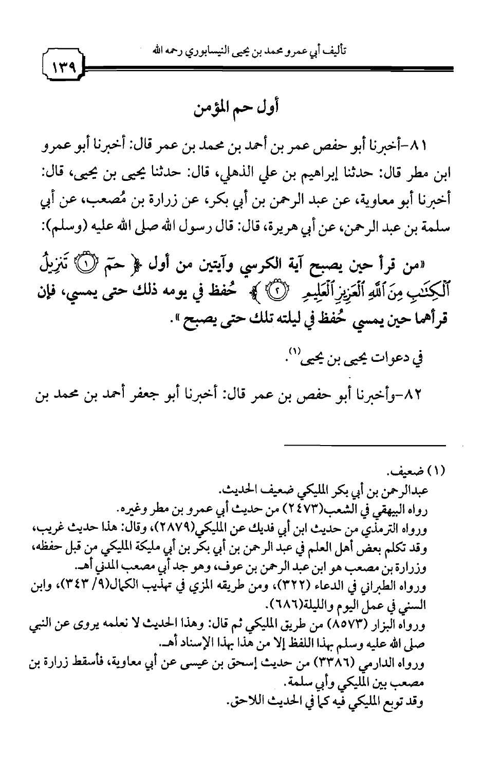 81 - أخبرنا أبو حفص عمر بن أحمد بن محمد بن عمر قال: أخبرنا أبو عمرو بن مطر قال: حدثنا إبراهيم بن علي الذهلي، قال: حدثنا يحيى بن يحيى، قال: أخبرنا أبو معاوية، عن عبد الرحمن بن أبي بكر، عن زرارة بن مصعب، عن أبي سلمة بن عبد الرحمن، عن أبي هريرة، قال: قال رسول الله صلى الله عليه وسلم: