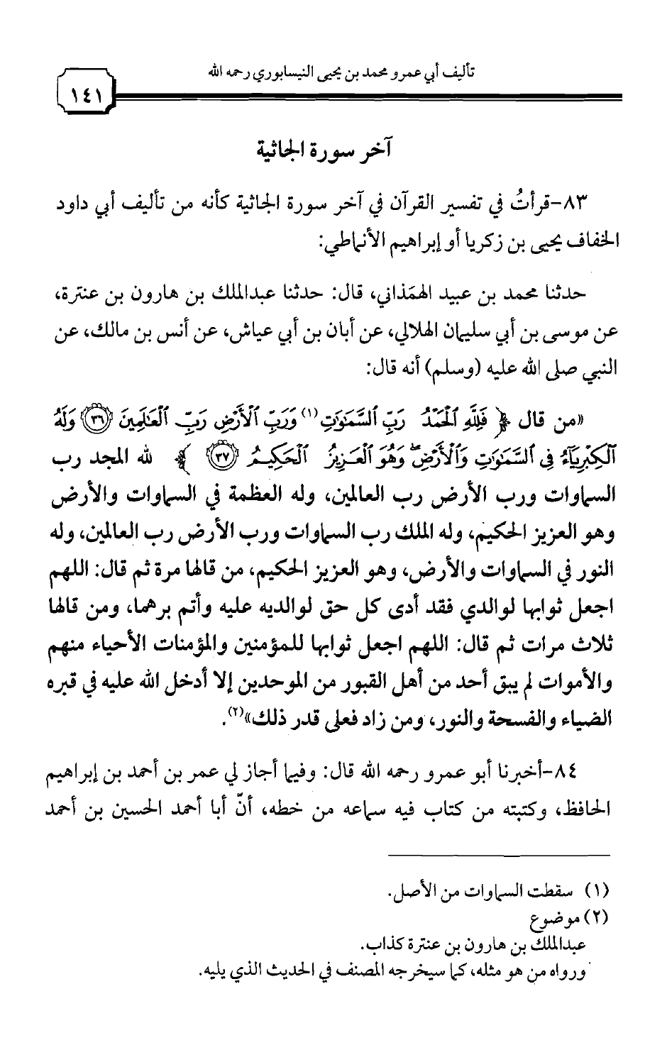 83 - قرأت في تفسير القرآن في آخر سورة الجاثية كأنه من تأليف أبي داود الخفاف يحيى بن زكريا أو إبراهيم الأنماطي: