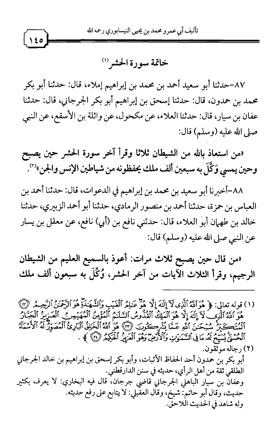 87 - حدثنا أبو سعيد أحمد بن محمد بن إبراهيم إملاء، قال: حدثنا أبو بكر محمد بن حمدون، قال: حدثنا إسحاق بن إبراهيم أبو بكر الجرجاني، قال: حدثنا عفان بن سيار، قال: حدثنا العلاء، عن مكحول، عن واثلة بن الأسقع، عن النبي صلى الله عليه وسلم قال:
