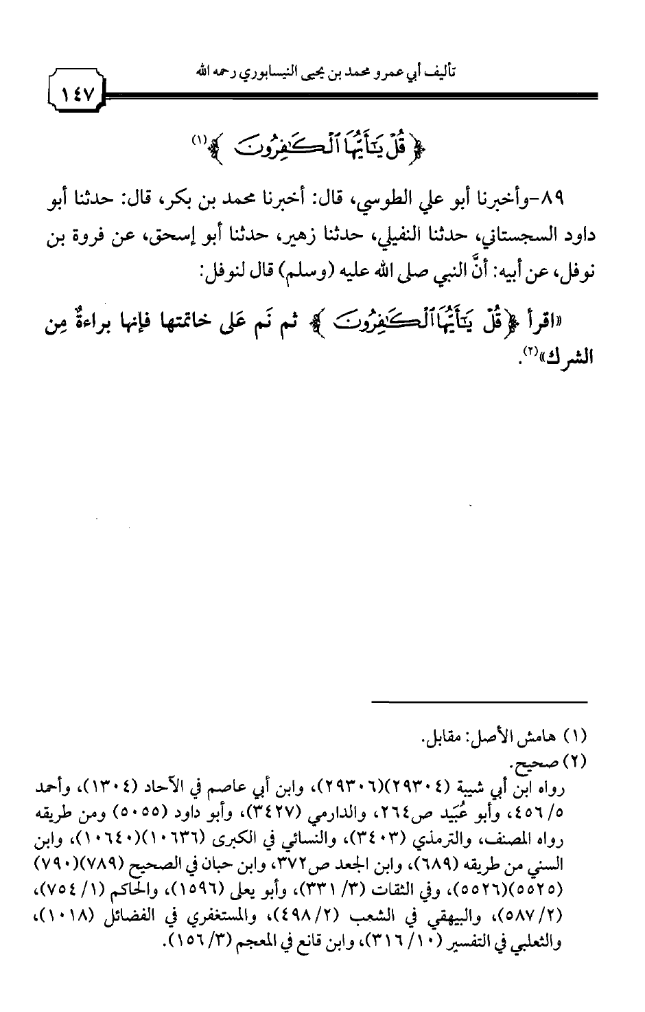 89 - وأخبرنا أبو علي الطوسي، قال: أخبرنا محمد بن بكر، قال: حدثنا أبو داود السجستاني، حدثنا النفيلي، حدثنا زهير، حدثنا أبو إسحاق، عن فروة بن نوفل، عن أبيه: أن النبي صلى الله عليه وسلم قال لنوفل: