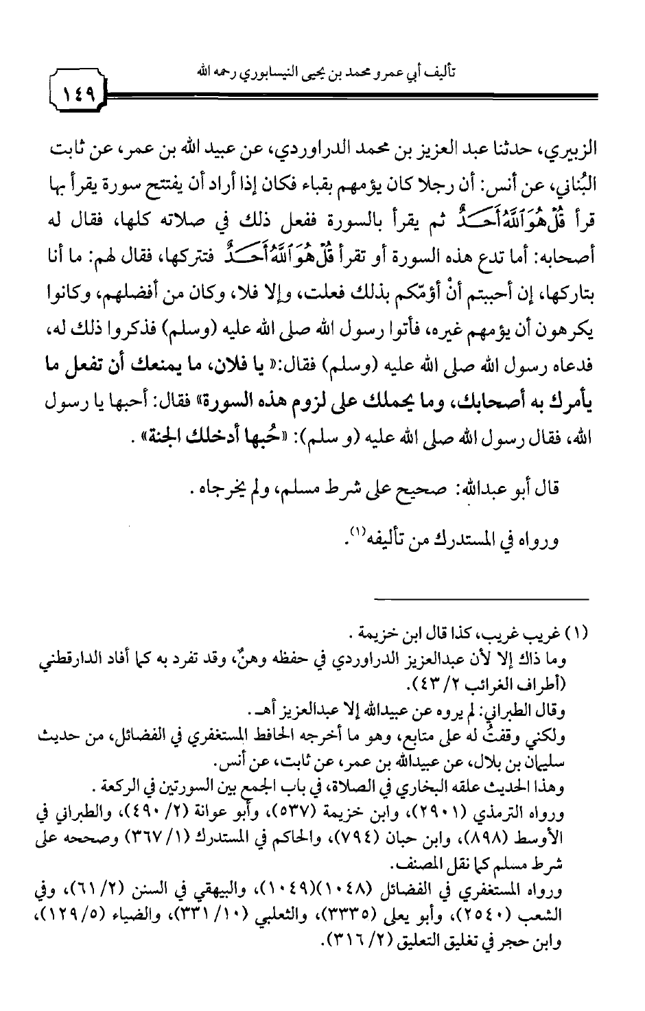 91 - أخبرنا أبو عبد الله محمد بن عبد الله الحافظ قراءة عليه، قال: حدثنا علي بن حمشاذ العدل، حدثنا علي بن الصقر السكري، حدثنا إبراهيم بن حمزة الزبيري، حدثنا عبد العزيز بن محمد الدراوردي، عن عبيد الله بن عمر، عن ثابت البناني، عن أنس: أن رجلا كان يؤمهم بقباء فكان إذا أراد أن يفتتح سورة يقرأ بها قرأ قل هو الله أحد ثم يقرأ بالسورة ففعل ذلك في صلاته كلها، فقال له أصحابه: أما تدع هذه السورة أو تقرأ قل هو الله أحد فتتركها، فقال لهم: ما أنا بتاركها، إن أحببتم أن أؤمكم بذلك فعلت، وإلا فلا، وكان من أفضلهم، وكانوا يكرهون أن يؤمهم غيره، فأتوا رسول الله صلى الله عليه وسلم فذكروا ذلك له، فدعاه رسول الله صلى الله عليه وسلم فقال: "يا فلان، ما يمنعك أن تفعل ما يأمرك به أصحابك، وما يحملك على لزوم هذه السورة" فقال: أحبها يا رسول الله، فقال رسول الله صلى الله عليه وسلم: "حبها أدخلك الجنة".