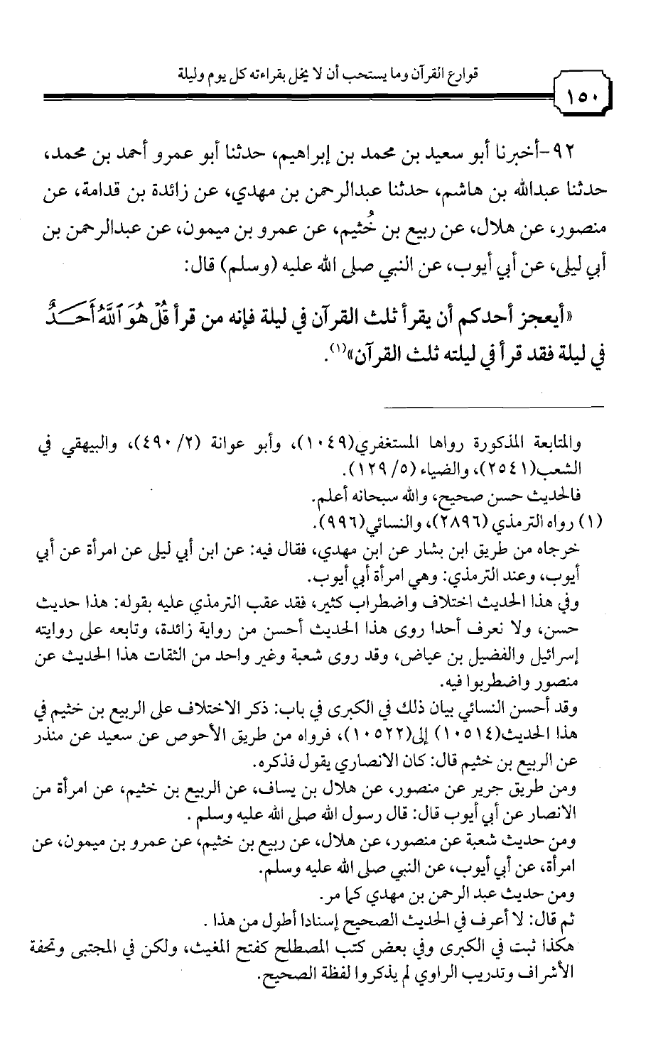 92 - أخبرنا أبو سعيد بن محمد بن إبراهيم، حدثنا أبو عمرو أحمد بن محمد، حدثنا عبد الله بن هاشم، حدثنا عبد الرحمن بن مهدي، عن زائدة بن قدامة، عن منصور، عن هلال، عن ربيع بن خثيم، عن عمرو بن ميمون، عن عبد الرحمن بن أبي ليلى، عن أبي أيوب، عن النبي صلى الله عليه وسلم قال: "أيعجز أحدكم أن يقرأ ثلث القرآن في ليلة فإنه من قرأ قل هو الله أحد في ليلة فقد قرأ في ليلته ثلث القرآن".