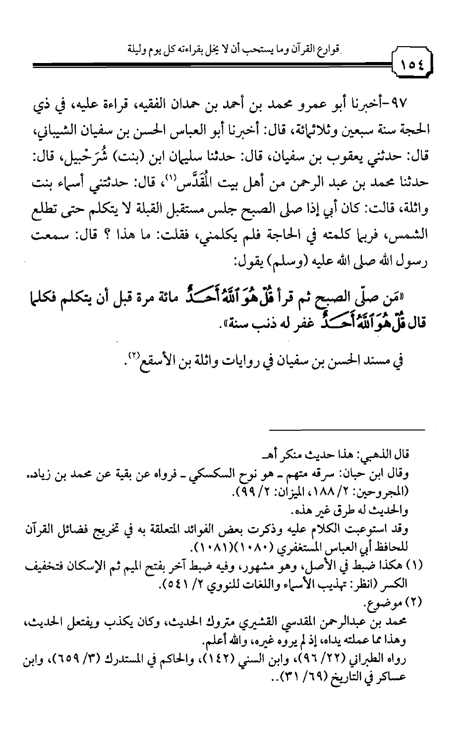 97 - أخبرنا أبو عمرو محمد بن أحمد بن حمدان الفقيه، قراءة عليه، في ذي الحجة سنة سبعين وثلاثمائة، قال: أخبرنا أبو العباس الحسن بن سفيان الشيباني، قال: حدثني يعقوب بن سفيان، قال: حدثنا سليمان ابن بنت شرحبيل، قال: حدثنا محمد بن عبد الرحمن من أهل بيت المقدس، قال: حدثتني أسماء بنت واثلة، قالت: كان أبي إذا صلى الصبح جلس مستقبل القبلة لا يتكلم حتى تطلع الشمس، فربما كلمته في الحاجة فلم يكلمني، فقلت: ما هذا؟ قال: سمعت رسول الله صلى الله عليه وسلم يقول: