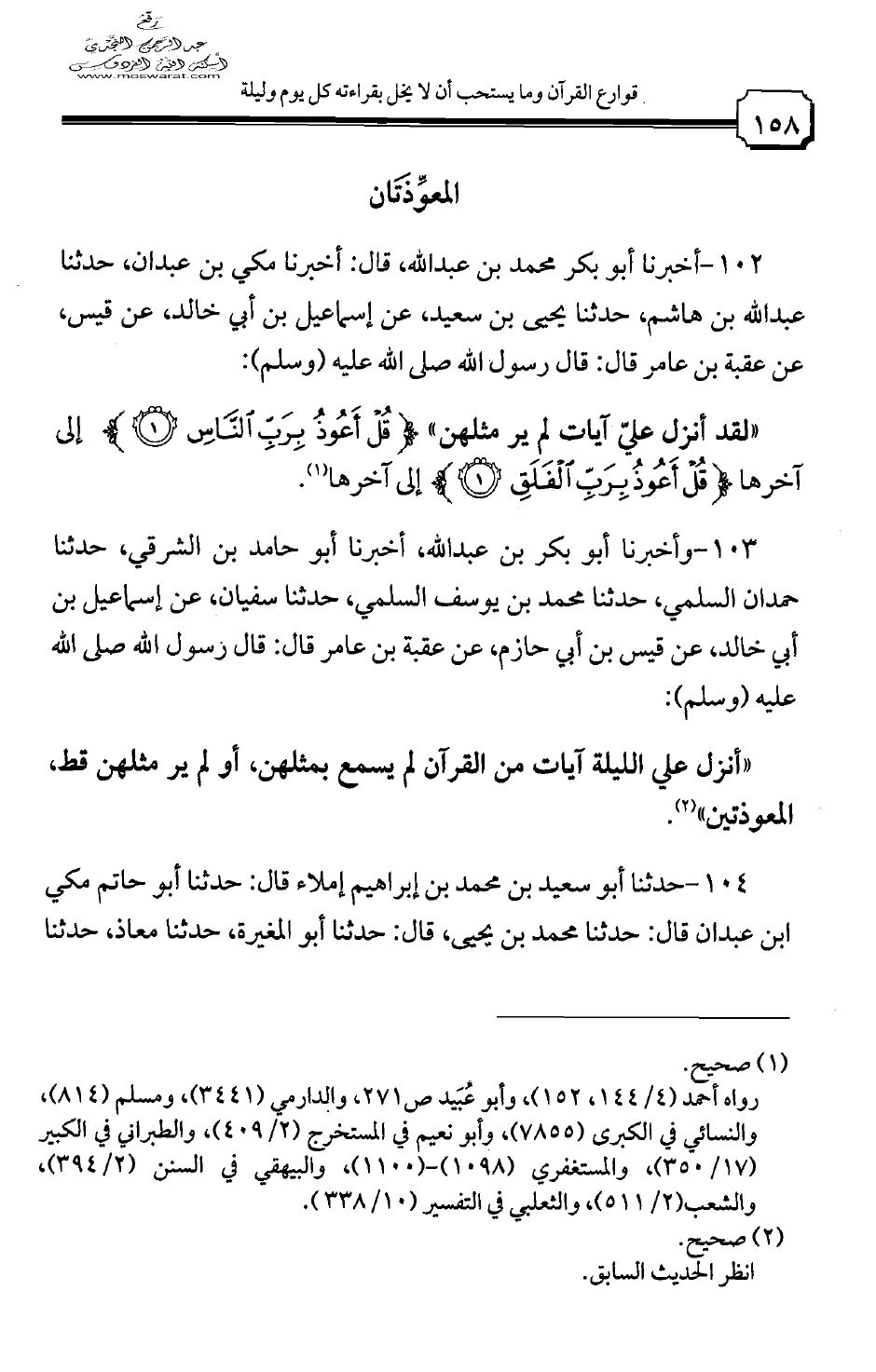 102 - أخبرنا أبو بكر محمد بن عبد الله، قال: أخبرنا مكي بن عبدان، حدثنا عبد الله بن هاشم، حدثنا يحيى بن سعيد، عن إسماعيل بن أبي خالد، عن قيس، عن عقبة بن عامر قال: قال رسول الله صلى الله عليه وسلم: