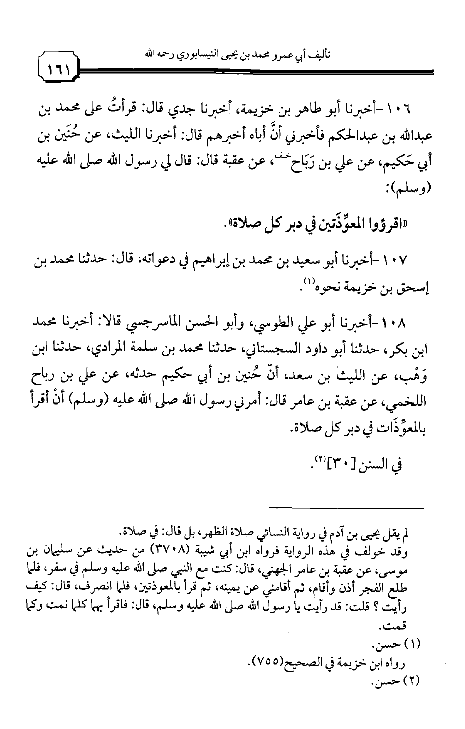 108 - أخبرنا أبو علي الطوسي، وأبو الحسن الماسرجسي قالا: أخبرنا محمد بن بكر، حدثنا أبو داود السجستاني، حدثنا محمد بن سلمة المرادي، حدثنا ابن وهب، عن الليث بن سعد، أن حنين بن أبي حكيم حدثه، عن علي بن رباح اللخمي، عن عبقة بن عامر قال: أمرني رسول الله صلى الله عليه وسلم أن أقرأ بالمعوذات في دبر كل صلاة.