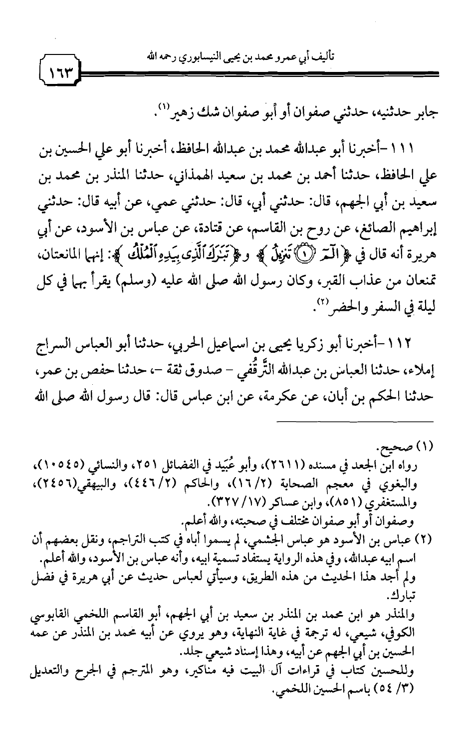 111 - أخبرنا أبو عبد الله محمد بن عبد الله الحافظ، أخبرنا أبو علي الحسين بن علي الحافظ، حدثنا أحمد بن محمد بن سعيد الهمذاني، حدثنا المنذر بن محمد بن سعيد بن أبي الجهم، قال: حدثني أبي، قال: حدثني عمي، عن أبيه قال: حدثني إبراهيم الصائغ، عن روح بن القاسم، عن قتادة، عن عباس بن الأسود، عن أبي هريرة أنه قال في {الم (1) تنزيل} و {تبارك الذي بيده الملك}: إنهما المانعتان، تمنعان من عذاب القبر، وكان رسول الله صلى الله عليه وسلم يقرأ بهما في كل ليلة في السفر والحضر.