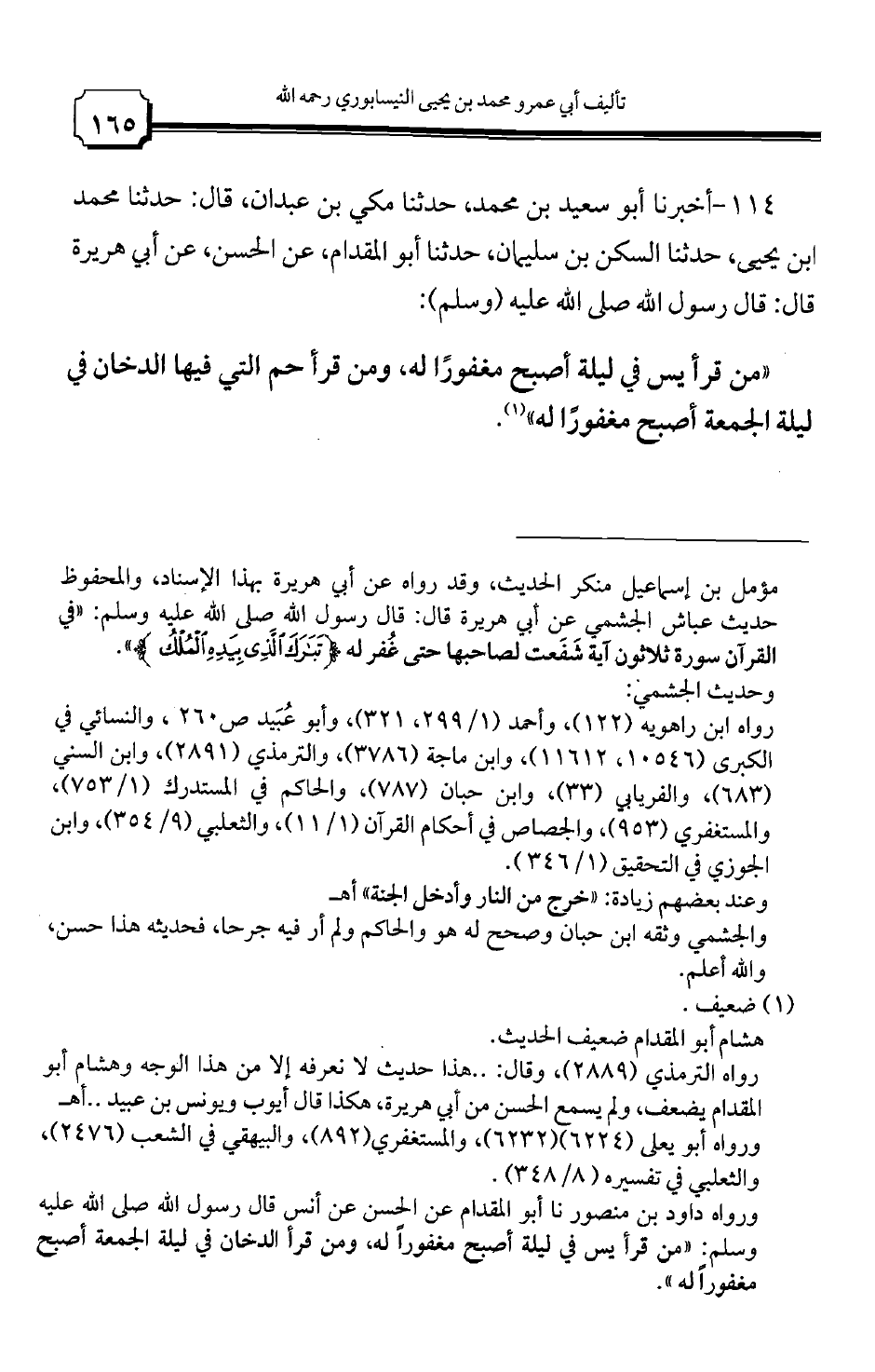 114 - أخبرنا أبو سعيد بن محمد، حدثنا مكي بن عبدان، قال: حدثنا محمد بن يحيى، حدثنا السكن بن سليمان، حدثنا أبو المقدام، عن الحسن، عن أبي هريرة قال: قال رسول الله صلى الله عليه وسلم: "من قرأ يس في ليلة أصبح مغفورا له، ومن قرأ حم التي فيها الدخان في ليلة الجمعة أصبح مغفورا له".