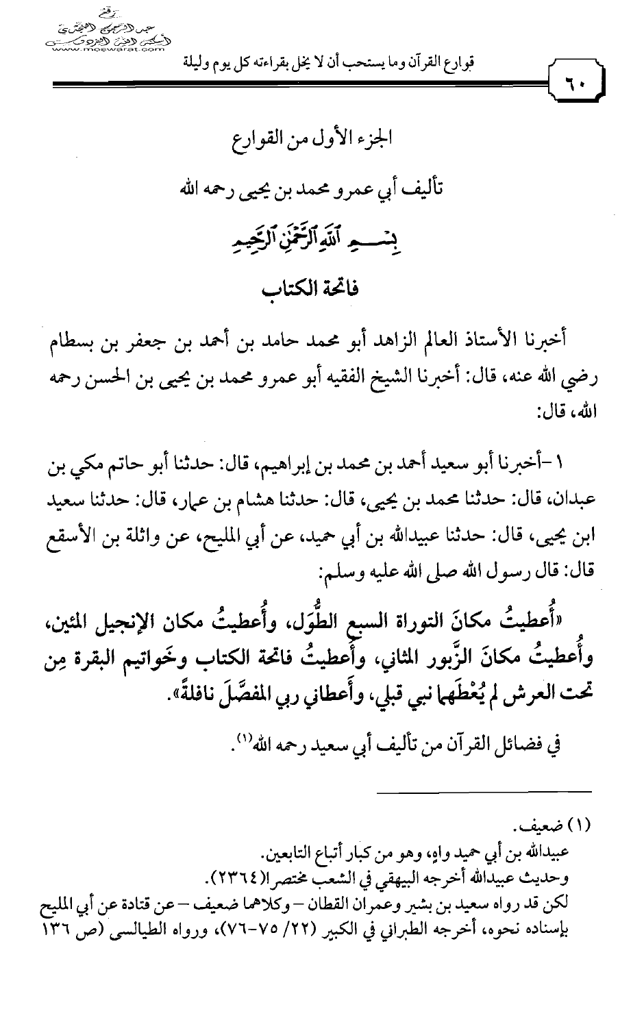 1 - أخبرنا أبو سعيد أحمد بن محمد بن إبراهيم، قال: حدثنا أبو حاتم مكي بن عبدان، قال: حدثنا محمد بن يحيى، قال: حدثنا هشام بن عمار، قال: حدثنا سعيد بن يحيى، قال: حدثنا عبيد الله بن أبي حميد، عن أبي المليح، عن واثلة بن الأسقع قال: قال رسول الله صلى الله عليه وسلم: "أعطيت مكان التوراة السبع الطول، وأعطيت مكان الإنجيل المئين، وأعطيت مكان الزبور المثاني، وأعطيت فاتحة الكتاب وخواتيم البقرة من تحت العرش لم يعطهما نبي قبلي، وأعطاني ربي المفصل نافلة".