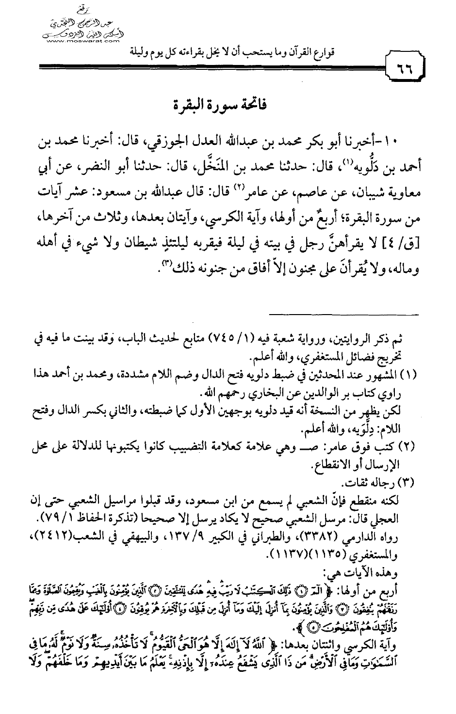 10 - أخبرنا أبو بكر محمد بن عبد الله العدل الجوزقي، قال: أخبرنا محمد بن أحمد بن دلويه، قال: حدثنا محمد بن المنخل، قال: حدثنا أبو النضر، عن أبي معاوية شيبان، عن عاصم، عن عامر قال: قال عبد الله بن مسعود: عشر آيات من سورة البقرة، أربع من أولها، وآية الكرسي، وآيتان بعدها، وثلاث من آخرها، لا يقرأهن رجل في بيته في ليلة فيقربه ليلتئذ شيطان ولا شيء في أهله وماله، ولا يقرأن على مجنون إلا أفاق من جنونه ذلك.