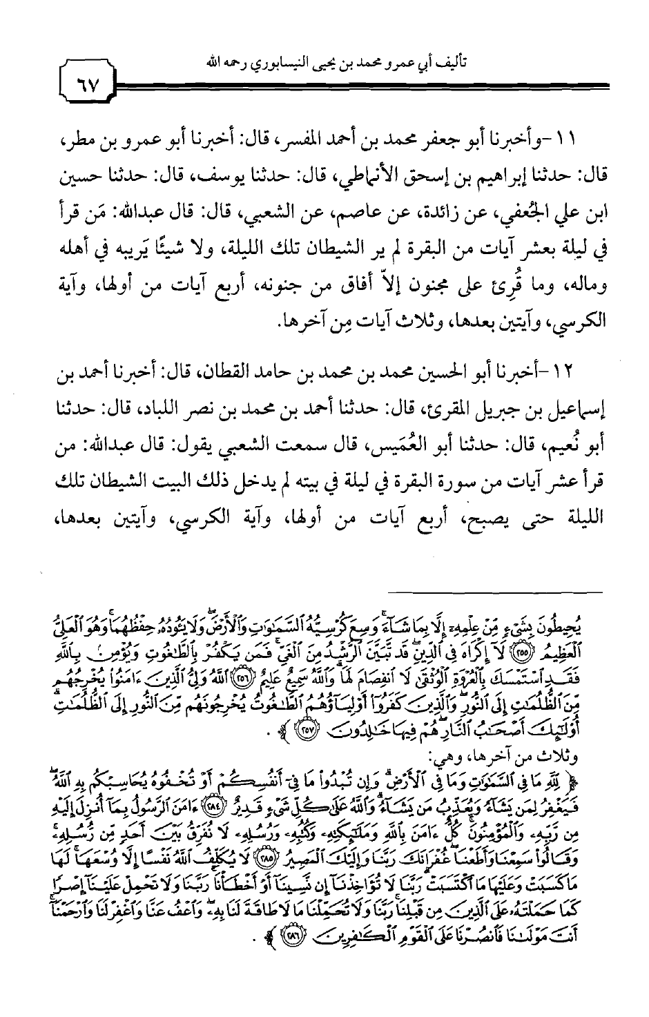 11 - وأخبرنا أبو جعفر محمد بن أحمد المفسر، قال: أخبرنا أبو عمرو بن مطر، قال: حدثنا إبراهيم بن إسحاق الأنماطي، قال: حدثنا يوسف، قال: حدثنا حسين بن علي الجعفي، عن زائدة، عن عاصم، عن الشعبي، قال: قال عبد الله: من قرأ في ليلة بعشر آيات من البقرة لم ير الشيطان تلك الليلة، ولا شيئا يريبه في أهله وماله، وما قرىء على مجنون إلا أفاق من جنونه، أربع آيات من أولها، وآية الكرسي، وآيتين بعدها، وثلاث آيات من آخرها.