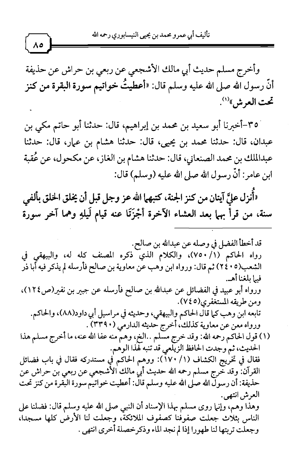 35 - أخبرنا أبو سعيد بن محمد بن إبراهيم، قال: حدثنا أبو حاتم مكي بن عبدان، قال: حدثنا محمد بن يحيى، قال: حدثنا هشام بن عمار، قال: حدثنا عبد الملك بن محمد الصنعاني، قال: حدثنا هشام بن الغاز، عن مكحول، عن عقبة بن عامر: أن رسول الله صلى الله عليه وسلم قال: "أنزل علي آيتان من كنز الجنة، كتبها الله عز وجل قبل أن يخلق الخلق بألفي سنة، من قرأ بهما بعد العشاء الآخرة أجزتا عنه قيام ليلة وهما آخر سورة البقرة".
