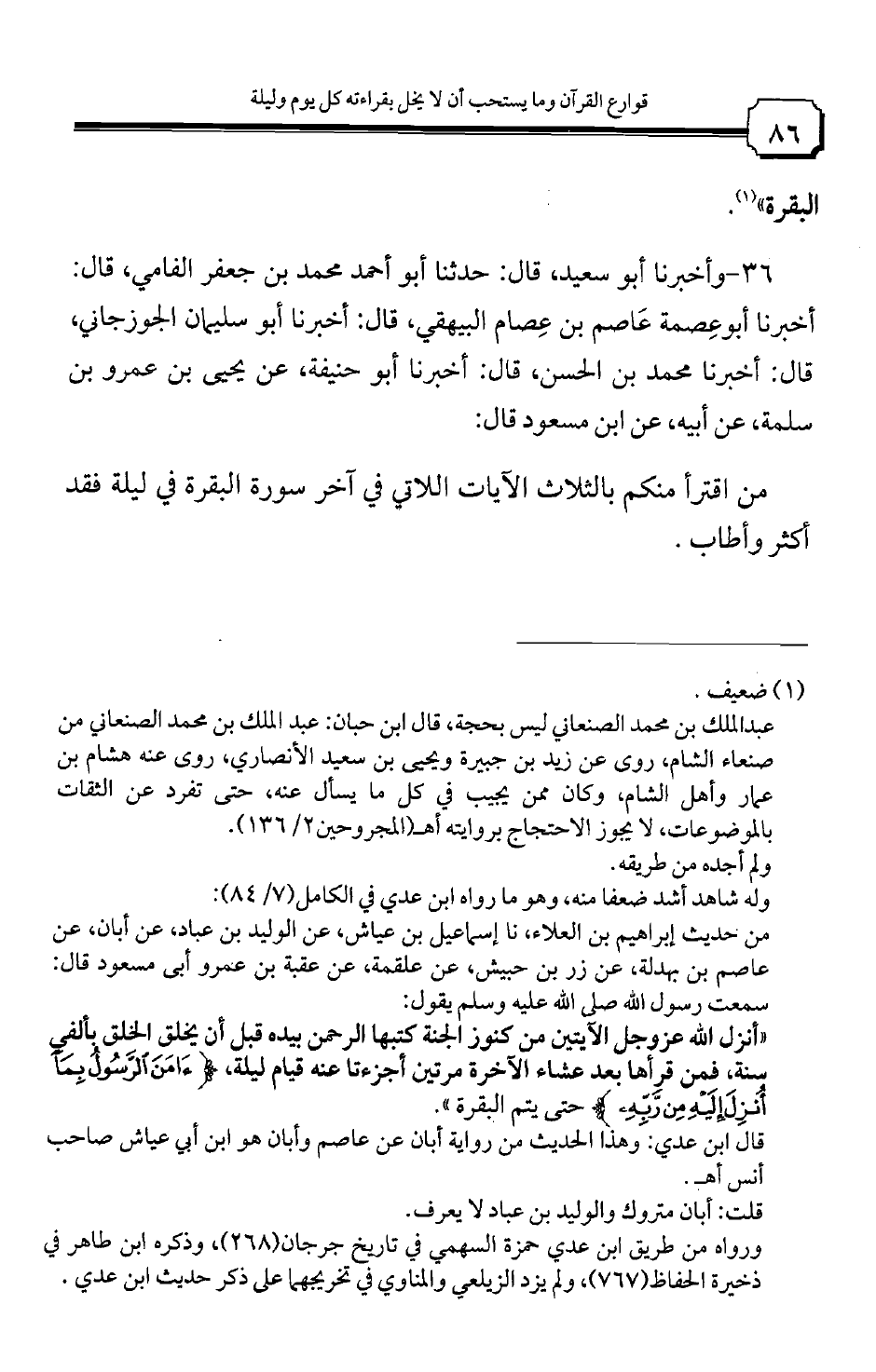 36 - وأخبرنا أبو سعيد، قال: حدثنا أبو أحمد محمد بن جعفر الفامي، قال: أخبرنا أبو عصمة عاصم بن عصام البيهقي، قال: أخبرنا أبو سليمان الجوزجاني، قال: أخبرنا محمد بن الحسن، قال: أخبرنا أبو حنيفة، عن يحيى بن عمرو بن سلمة، عن أبيه، عن ابن مسعود قال: من اقترأ منكم بالثلاث الآيات اللاتي في آخر سورة البقرة في ليلة فقد أكثر وأطاب.