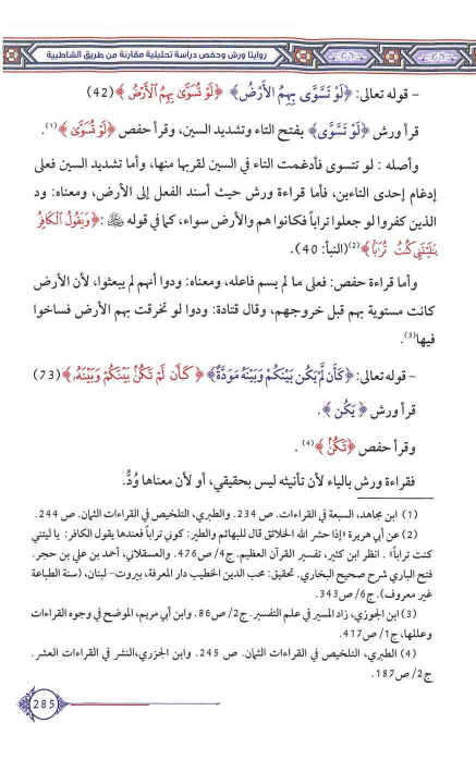 وأصله: لو تتسوى فأدغمت التاء في السين لقربها منها، وأما تشديد السين فعلى إدغام إحدى التاءين، فأما قراءة ورش حيث أسند الفعل إلى الأرض، ومعناه: ود الذين كفروا لو جعلوا تراباً فكانوا هم والأرض سواء، كما في قوله عز وجل {وَيَقُولُ الْكَافِرُ يَا لَيْتَنِي كُنتُ تُرَاباً} (¬2) {النبأ40}. وأما قراءة حفص: فعلى ما لم يسم فاعله، ومعناه: ودوا أنهم لم يبعثوا، لأن الأرض كانت مستوية بهم قبل خروجهم، وقال قتادة: ودوا لو تخرقت بهم الأرض فساخوا فيها (¬3).