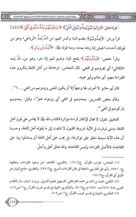 قال النحاس: "وجماعة من أهل اللغة ينكرون هذه القراءة منهم: أبو حاتم وأبو عبيد، قال أبو حاتم: لا أعرف لها وجهاً إلا أن يكون المعنى يزيدونهم من الغي .... " (¬1) , وقال بعض المفسرين: يمدونهم في الغي أي يزينونه لهم (¬2) , وقيل: يمدونهم يتركونهم في الغي (¬3).