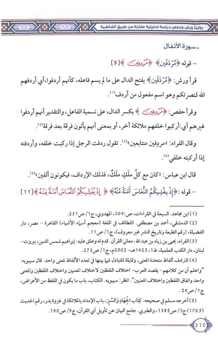 قرأ ورش: {مُرْدَفَين} بفتح الدال على ما لم يسم فاعله، كأنهم أردفوا، أي أردفهم الله لنصرتكم وهو اسم مفعول من أردف (¬1). وقرأ حفص: {مرْدِفين} بكسر الدال، على تسمية الفاعل، والتقدير أنهم أردفوا غيرهم أي: أركبوا خلفهم ملائكة أخر، أو بمعنى أنهم يأتون فرقة بعد فرقة (¬2).