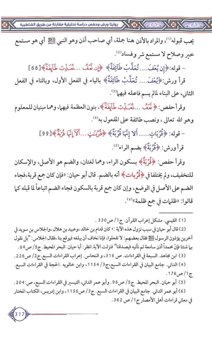 قرأ ورش: {يُعْفَ .... تُعَذَّبْ طَآئِفَةٌ} بالياء في الفعل الأول، وبالتاء في الفعل الثاني، على البناء لمالم يسم فاعله فيهما (¬3).