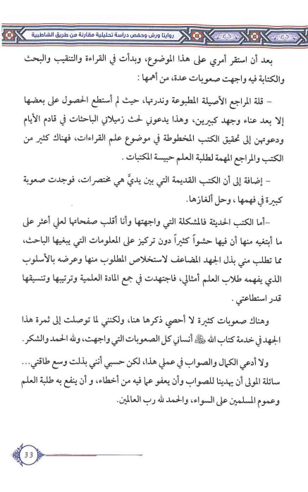 - قلة المراجع الأصيلة المطبوعة وندرتها، حيث لم أستطع الحصول على بعضها إلا بعد عناء وجهد كبير، وهذا يدعوني لحث زميلاتي الباحثات في قادم الأيام ودعوتهن إلى تحقيق الكتب المخطوطة في موضوع علم القراءات فهناك الكثير من الكتب والمراجع المهمة لطلبة العلم حبيسة المكتبات.