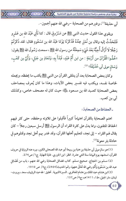 أبي حذيفة (¬1)، وغيرهم من الصحابة -رضي الله عنهم أجمعين-. ويقوي هذا القول حديث النبي صلى الله عليه وسلم عن مَسْرُوقٍ قال كنا نَأْتِي عَبْدَ اللَّهِ بن عَمْرٍو فَنَتَحَدَّثُ إليه وقال بن نُمَيْرٍ عِنْدَهُ فَذَكَرْنَا يَوْمًا عَبْدَ اللَّهِ بن مَسْعُودٍ فقال لقد ذَكَرْتُمْ رَجُلًا لَا أَزَالُ أُحِبُّهُ بَعْدَ شَيْءٍ سَمِعْتُهُ من رسول اللَّهِ صلى الله عليه وسلم سمعت رَسُولَ اللَّهِ صلى الله عليه وسلم يقول خُذُوا الْقُرْآنَ من أَرْبَعَةٍ من ابن أُمِّ عَبْدٍ فَبَدَأَ بِهِ وَمُعَاذِ بن جَبَلٍ وَأُبَيِّ بن كَعْبٍ وَسَالِمٍ مولى أبي حُذَيْفَةَ (¬2).