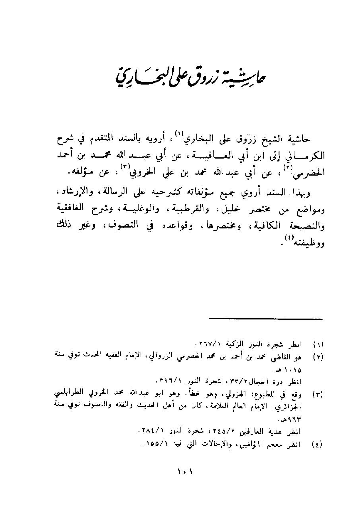 حَاشِيَة الشَّيْخ زَرُّوق على البُخَارِيّ أرويه بالسند الْمُتَقَدّم فِي شرح الْكرْمَانِي الى ابْن أبي الْعَافِيَة عَن أبي عبد الله مُحَمَّد بن أَحْمد الْحَضْرَمِيّ عَن أبي عبد الله مُحَمَّد بن عَليّ الخروبي عَن مُؤَلفه