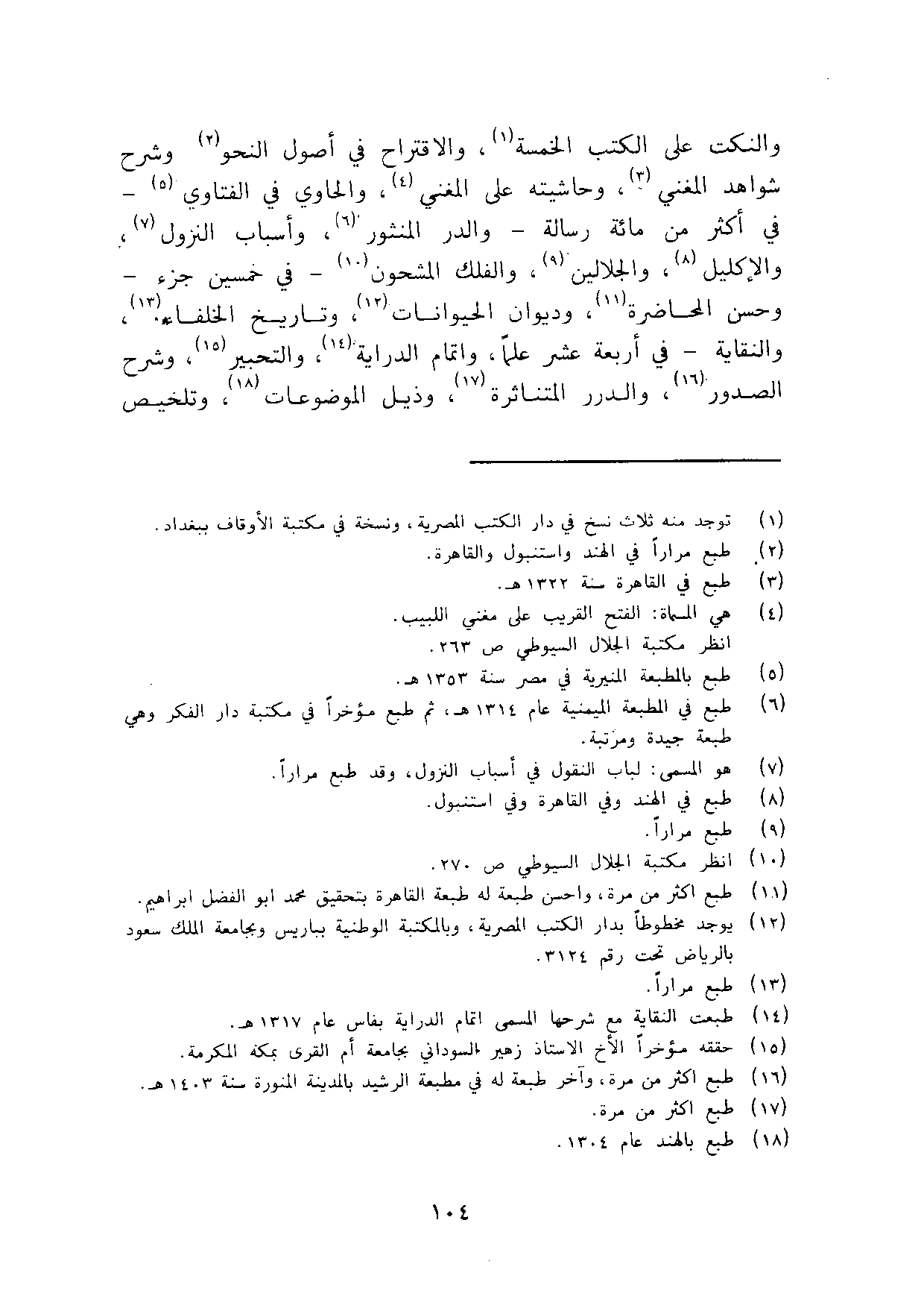 والنكت على الْكتب الْخَمْسَة والاقتراح فِي أصُول النَّحْو وَشرح شَوَاهِد الْمُغنِي وحاشيته على المغنى وَالْحَاوِي فِي الفتاوي فِي أَكثر من مائَة رِسَالَة والدر المنثور وَأَسْبَاب النُّزُول والإكليل والجلالين والفلك المشحون فِي خمسين جُزْء وَحسن المحاضرة وديوان الْحَيَوَانَات وتارخ الْخُلَفَاء والنقاية فِي أَرْبَعَة عشر علما واتمام الدِّرَايَة والتحبير وَشرح الصُّدُور والدرر المتناثرة وذيل الموضوعات وتلخيص