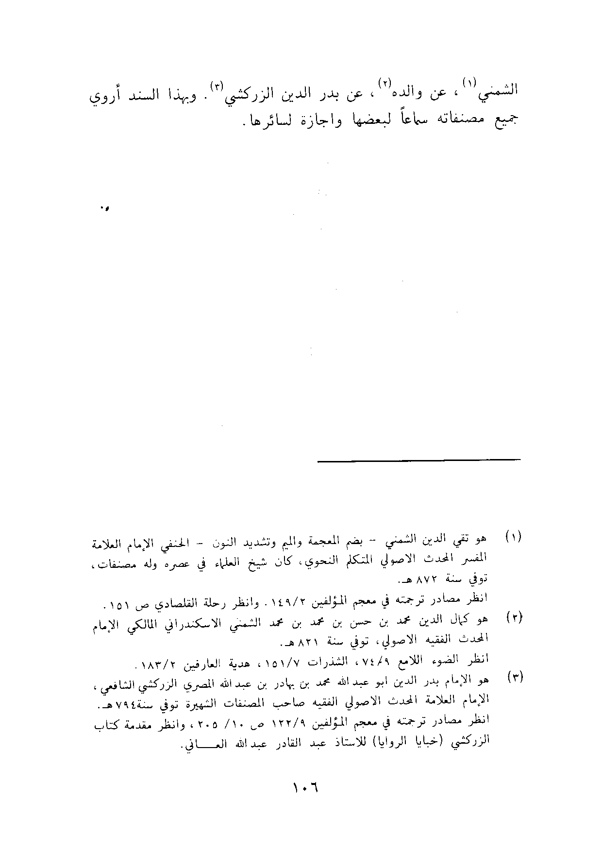 الشمني عَن وَالِده عَن بدر الدّين الزَّرْكَشِيّ وَبِهَذَا السَّنَد أروي جَمِيع مصنفاته سَمَاعا لبعضها واجازة لسائرها