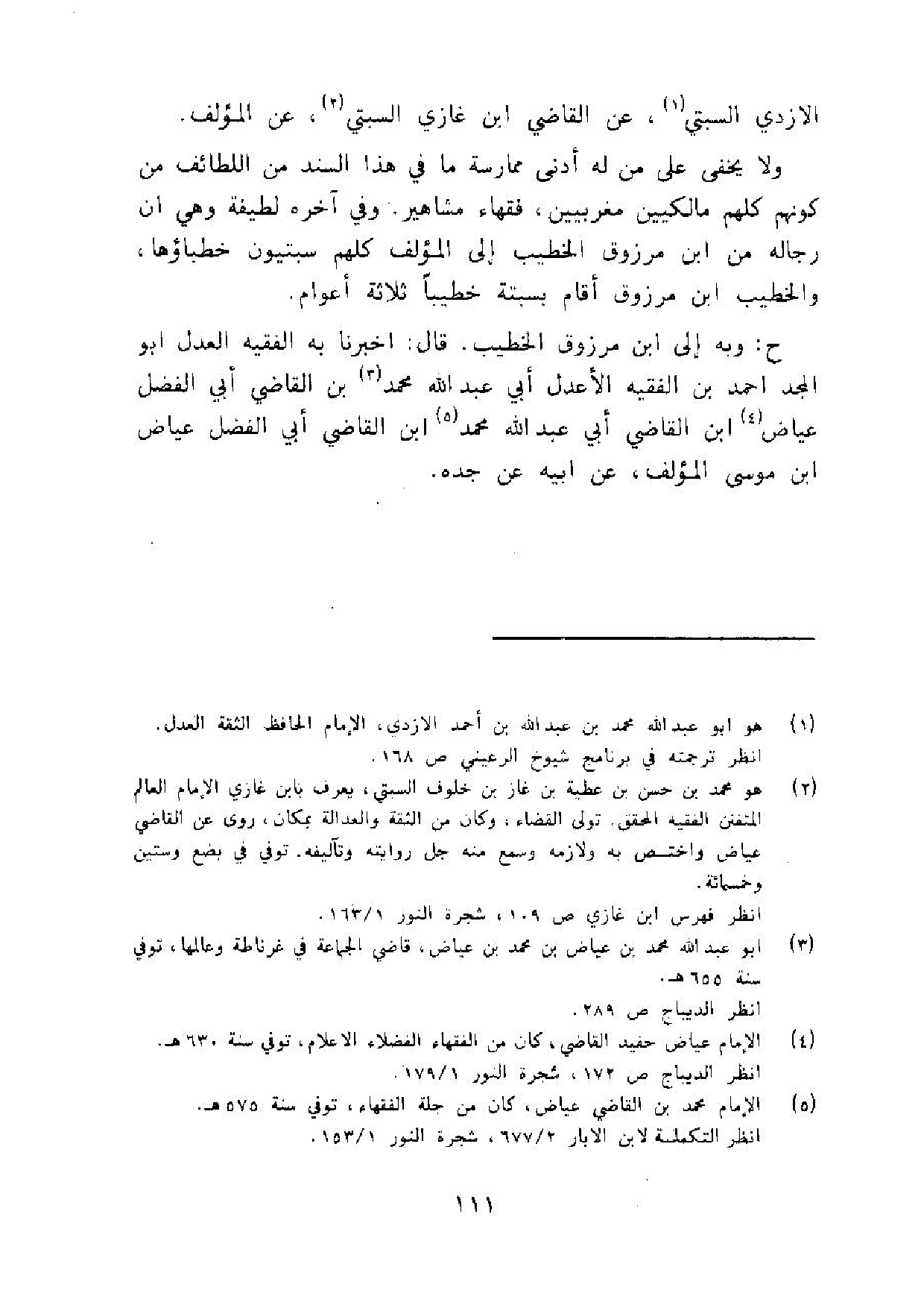 وَلَا يخفى على من لَهُ أدنى ممارسة مَا من فِي هَذَا السَّنَد مَا اللطائف من كَونهم كلهم مالكيين مغربيين فُقَهَاء مشاهير وَفِي آخِره لَطِيفَة وَهِي ان رِجَاله من ابْن مَرْزُوق الْخَطِيب الى الْمُؤلف كلهم سبتيون خطباؤها والخطيب ابْن مَرْزُوق أَقَامَ بسبتة خَطِيبًا ثَلَاثَة أَعْوَام