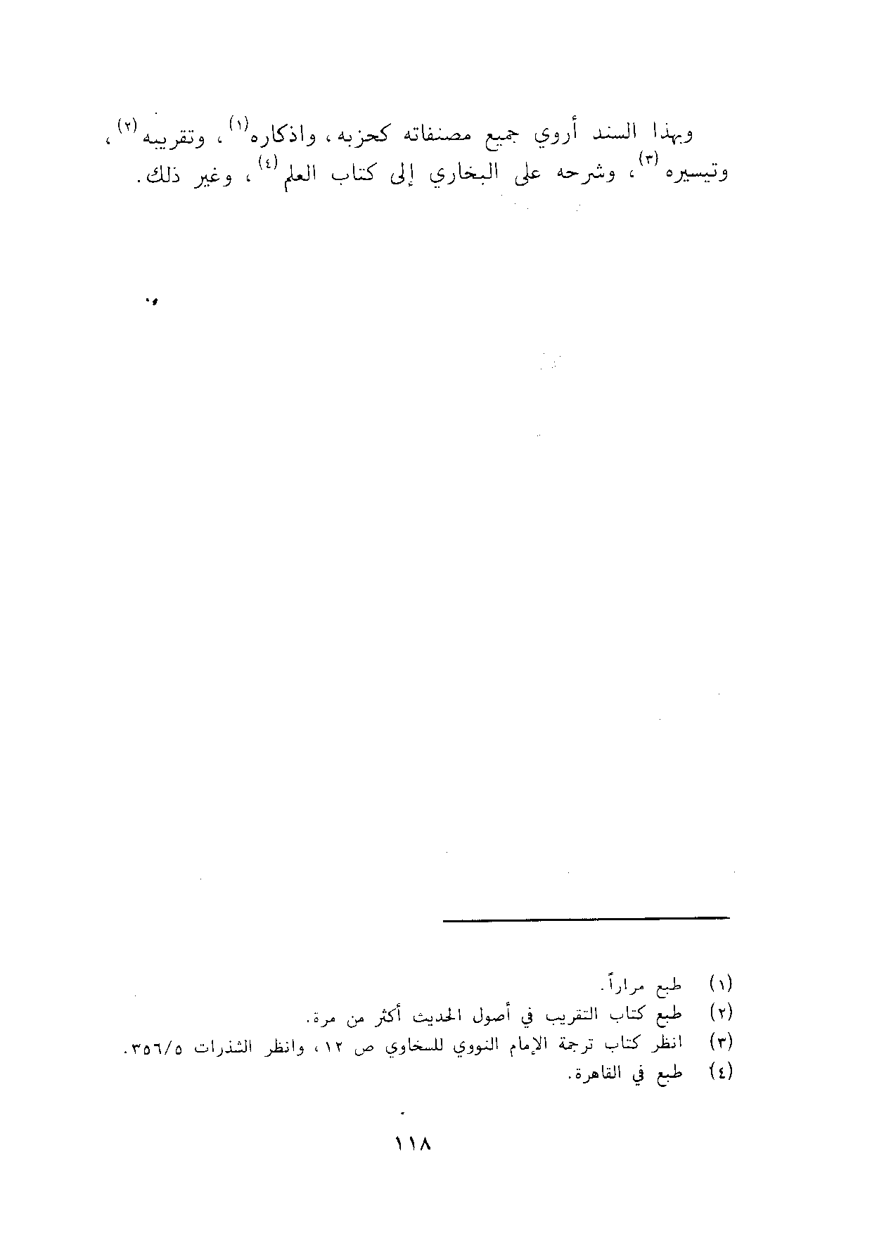 وَبِهَذَا السَّنَد أروي جَمِيع مصنفاته كحزبه واذكاره وتقريبه وتيسيره وَشَرحه على البُخَارِيّ الى كتاب الْعلم وَغَيره ذَلِك