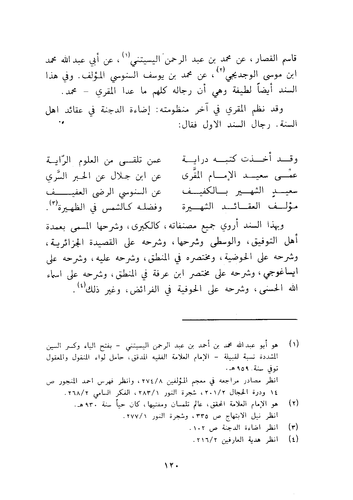 قَاسم الْقصار عَن مُحَمَّد بن عبد الرَّحْمَن اليسيتني عَن أبي عبد الله مُحَمَّد ابْن مُوسَى الوجديجي عَن مُحَمَّد بن يُوسُف السنوسي الْمُؤلف وَفِي هَذَا السَّنَد أَيْضا لَطِيفَة وَهِي أَن رِجَاله كلهم مَا عدا الْمقري مُحَمَّد