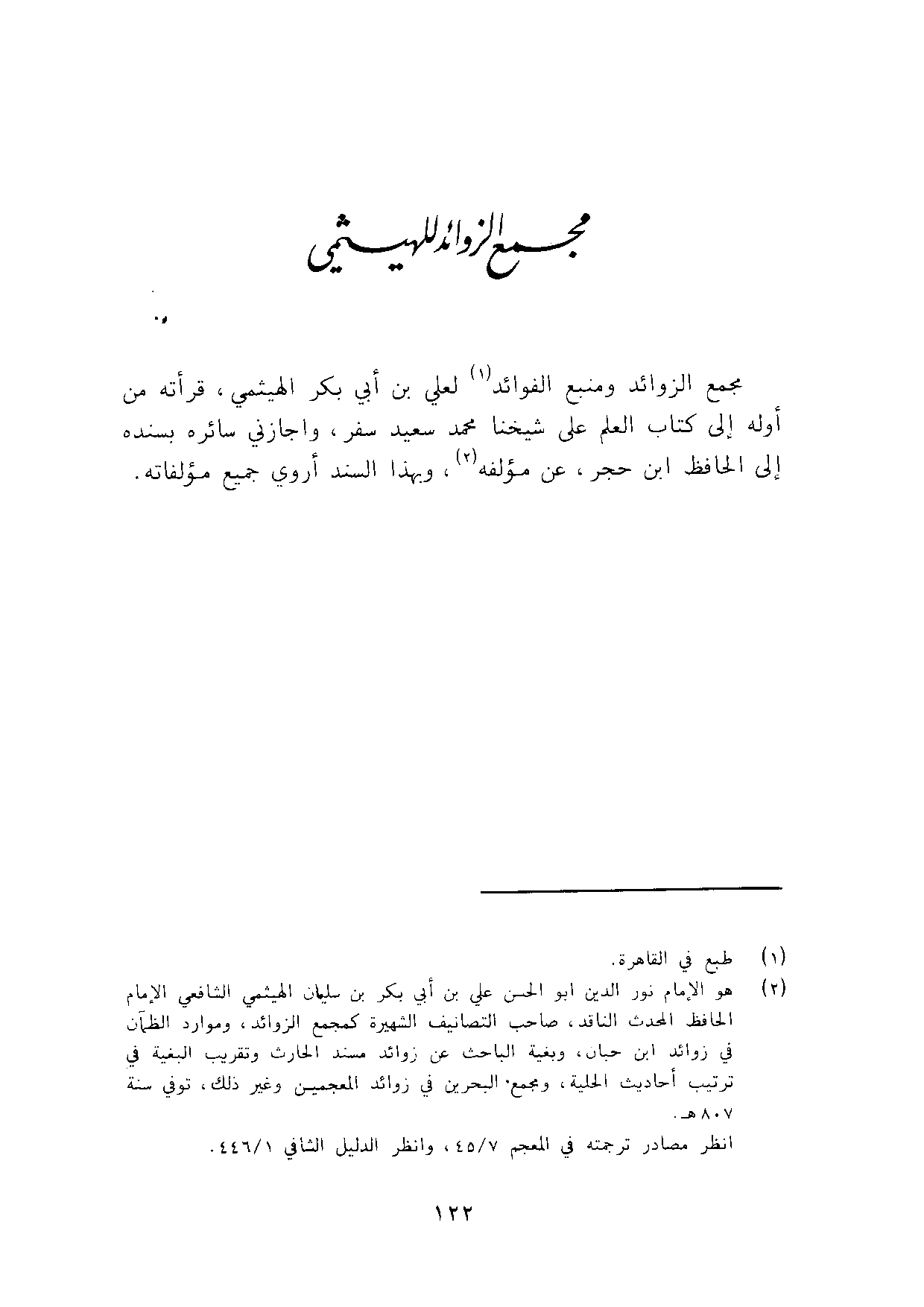 مجمع الزَّوَائِد ومنبع الْفَوَائِد لعَلي بن أبي بكر الهيثمي قرأته من اوله الى كتاب الْعلم على شَيخنَا مُحَمَّد سعيد سفر واجازني سائره بِسَنَدِهِ الى الْحَافِظ ابْن حجر عَن مُؤَلفه وَبِهَذَا السَّنَد أروي جَمِيع مؤلفاته