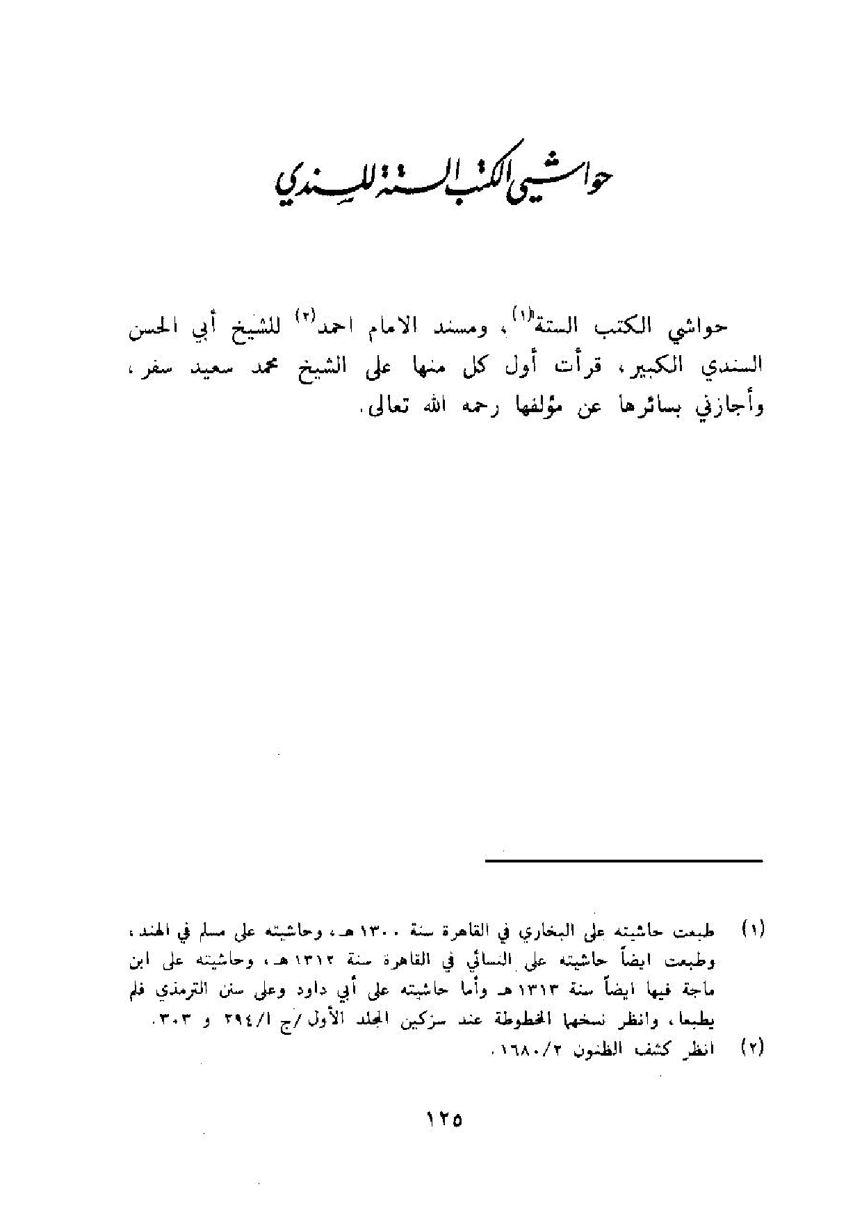 حَوَاشِي الْكتب السِّتَّة ومسند الامام احْمَد للشَّيْخ أبي الْحسن السندي الْكَبِير قَرَأت أول كل مِنْهَا على الشَّيْخ مُحَمَّد سعيد سفر وأجازني بسائرها عَن مؤلفها رَحمَه الله تَعَالَى