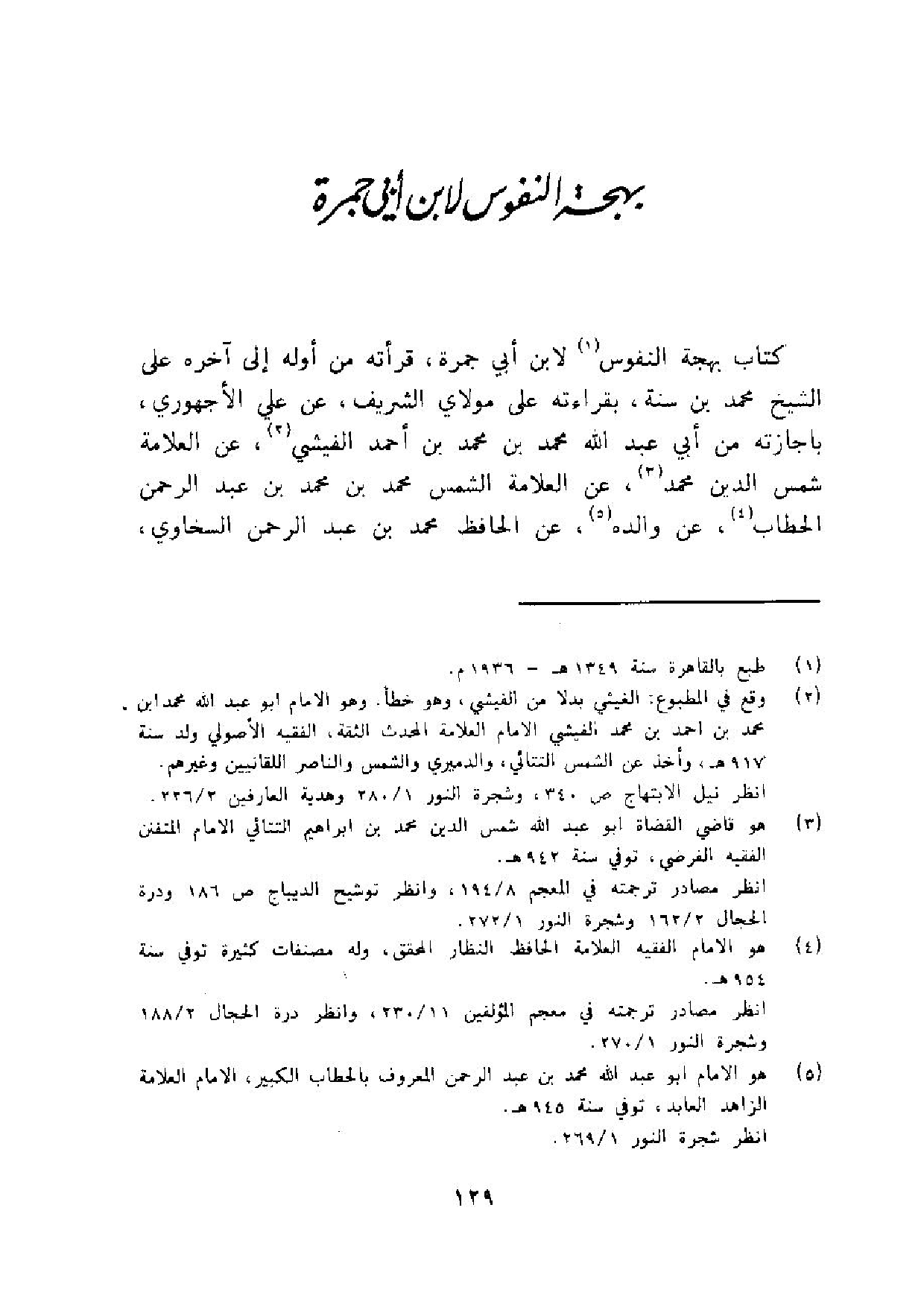 كتاب بهجة النُّفُوس لِابْنِ أبي جَمْرَة قرأته من أَوله الى آخِره على الشَّيْخ مُحَمَّد بن سنة بقرَاءَته على مولَايَ الشريف عَن عَليّ الأَجْهُورِيّ باجازته من أبي عبد الله مُحَمَّد بن مُحَمَّد بن أَحْمد الفيشي عَن الْعَلامَة شمس الدّين مُحَمَّد عَن الْعَلامَة الشَّمْس مُحَمَّد بن مُحَمَّد بن عبد الرَّحْمَن الْحطاب عَن وَالِده عَن الْحَافِظ مُحَمَّد بن عبد الرَّحْمَن السخاوي