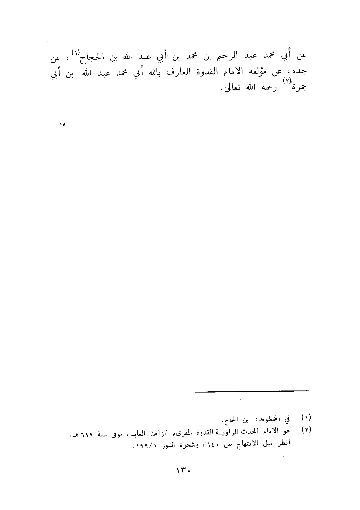 عَن أبي مُحَمَّد عبد الرَّحِيم بن مُحَمَّد بن أبي عبد الله بن الْحجَّاج عَن جده عَن مُؤَلفه الامام الْقدْوَة الْعَارِف بِاللَّه أبي مُحَمَّد عبد الله بن أبي جَمْرَة رَحمَه الله تَعَالَى