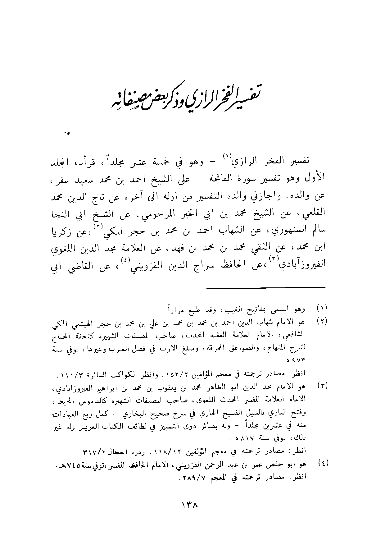 تَفْسِير الْفَخر الرَّازِيّ وَهُوَ فِي خَمْسَة عشر مجلدا قَرَأت المجلد الأول وَهُوَ تَفْسِير سُورَة الْفَاتِحَة على الشَّيْخ احْمَد بن مُحَمَّد سعيد سفر عَن وَالِده واجازني وَالِده التَّفْسِير من اوله الى آخِره عَن تَاج الدّين مُحَمَّد القلعي عَن الشَّيْخ مُحَمَّد بن ابي الْخَيْر المرحومي عَن الشَّيْخ ابي النجا سَالم السنهوري عَن الشهَاب احْمَد بن مُحَمَّد بن حجر الْمَكِّيّ عَن زَكَرِيَّا ابْن مُحَمَّد عَن الثقي مُحَمَّد بن مُحَمَّد بن فَهد عَن الْعَلامَة مجد الدّين اللّغَوِيّ الفيروزآبادي عَن الْحَافِظ سراج الدّين الْقزْوِينِي عَن القَاضِي ابي