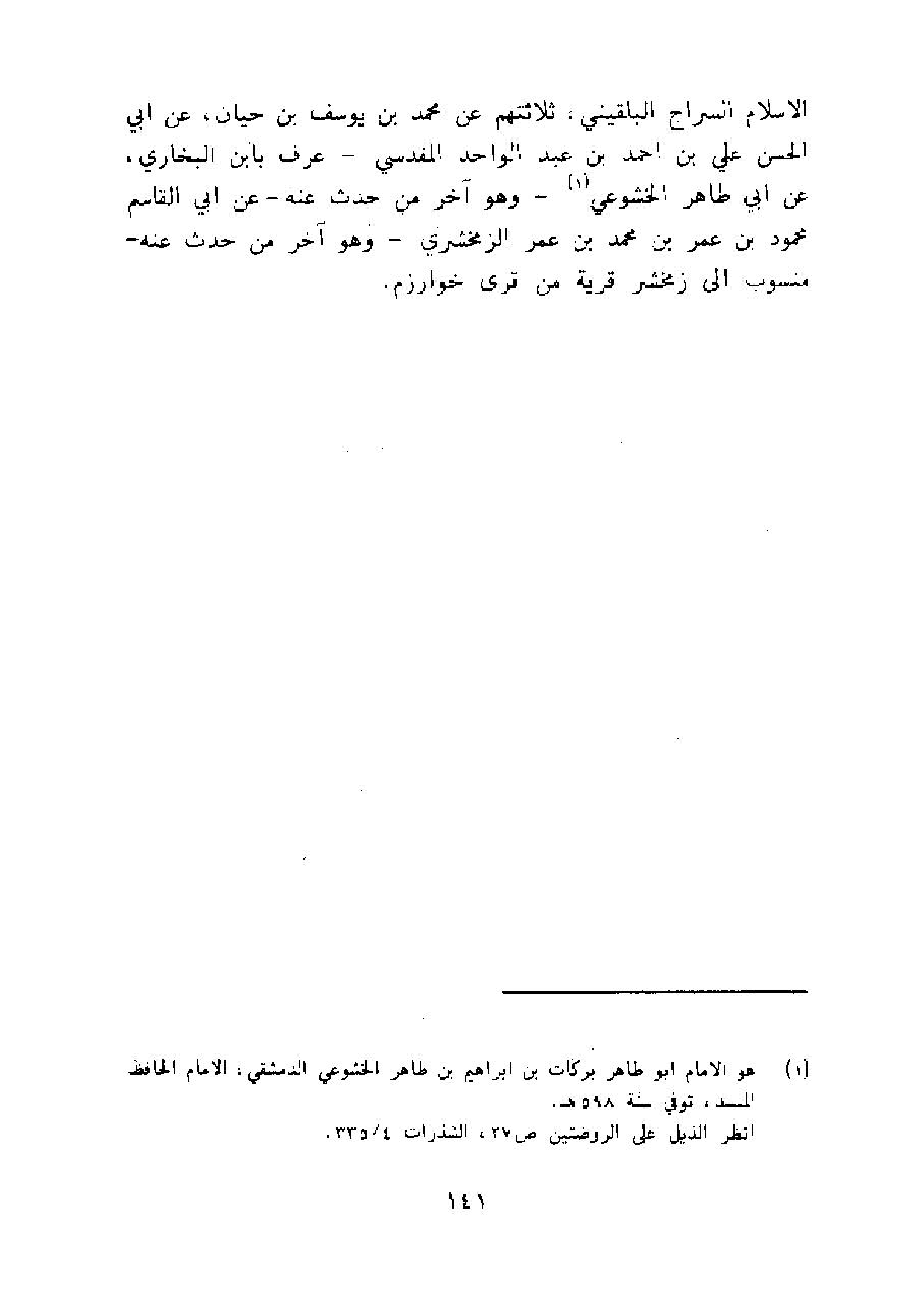 الاسلام السراج البُلْقِينِيّ ثَلَاثَتهمْ عَن مُحَمَّد بن يُوسُف بن حَيَّان عَن ابي الْحسن عَليّ بن احْمَد بن عبد الْوَاحِد الْمَقْدِسِي عرف بِابْن البُخَارِيّ عَن ابي طَاهِر الخشوعي وَهُوَ آخر من حدث عَنهُ عَن ابي الْقَاسِم مَحْمُود بن عمر بن مُحَمَّد بن عمر الزَّمَخْشَرِيّ وَهُوَ آخر من حدث عَنهُ مَنْسُوب الى زمخشر قَرْيَة من قرى خوارزم