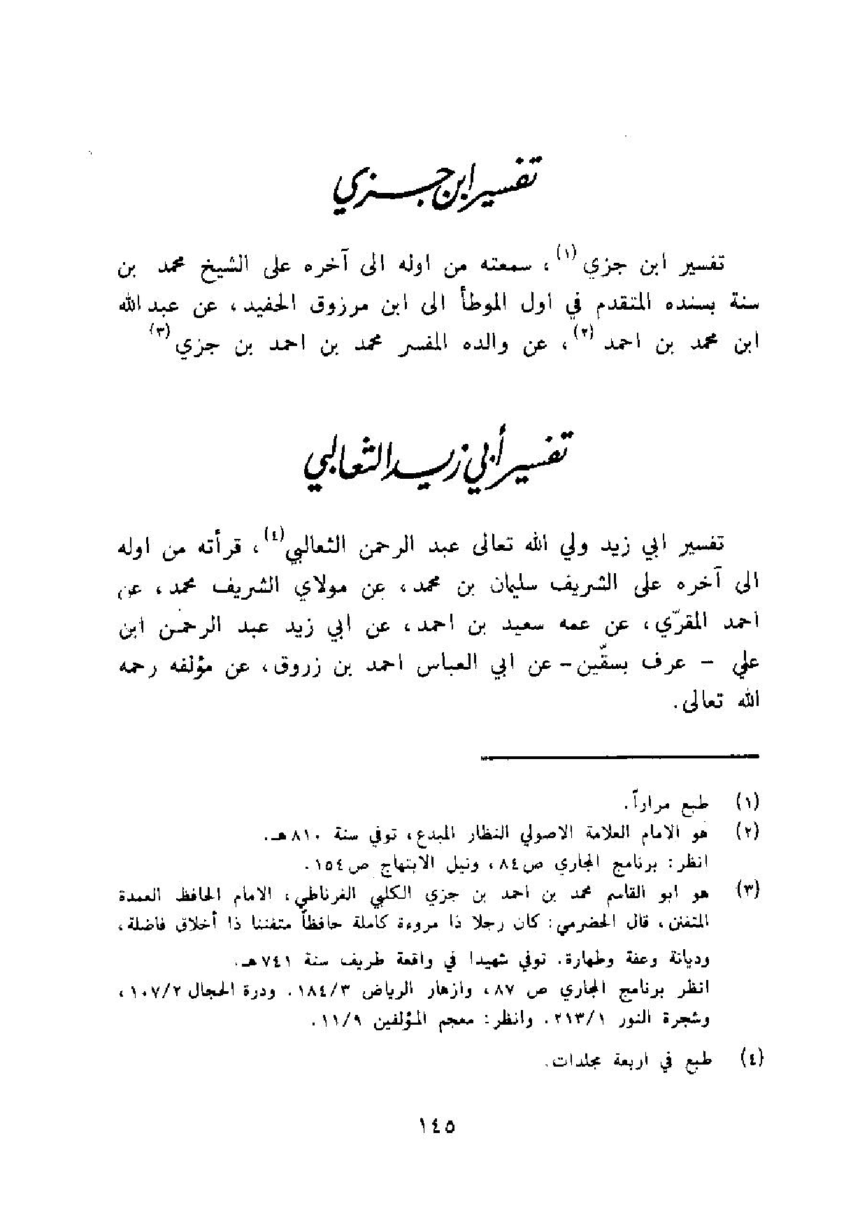تَفْسِير ابي زيد ولي الله تَعَالَى عبد الرَّحْمَن الثعالبي قرأته من اوله الى آخِره على الشريف سُلَيْمَان بن مُحَمَّد عَن مولَايَ الشريف مُحَمَّد عَن احْمَد الْمقري عَن عَمه سعيد بن احْمَد عَن ابي زيد عبد الرَّحْمَن ابْن عَليّ عرف بسقين عَن ابي الْعَبَّاس احْمَد بن زَرُّوق عَن مُؤَلفه رَحمَه الله تَعَالَى