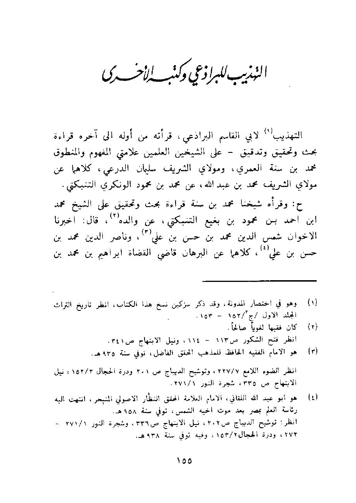 التَّهْذِيب لابي الْقَاسِم البراذعي قرأته من أَوله الى آخِره قِرَاءَة بحث وَتَحْقِيق وتدقيق على الشَّيْخَيْنِ العلمين علامتي الْمَفْهُوم والمنطوق مُحَمَّد بن سنة الْعمريّ ومولاي الشريف سُلَيْمَان الدرعي كِلَاهُمَا عَن مولَايَ الشريف مُحَمَّد بن عبد الله عَن مُحَمَّد بن مَحْمُود الونكري التنبكتي