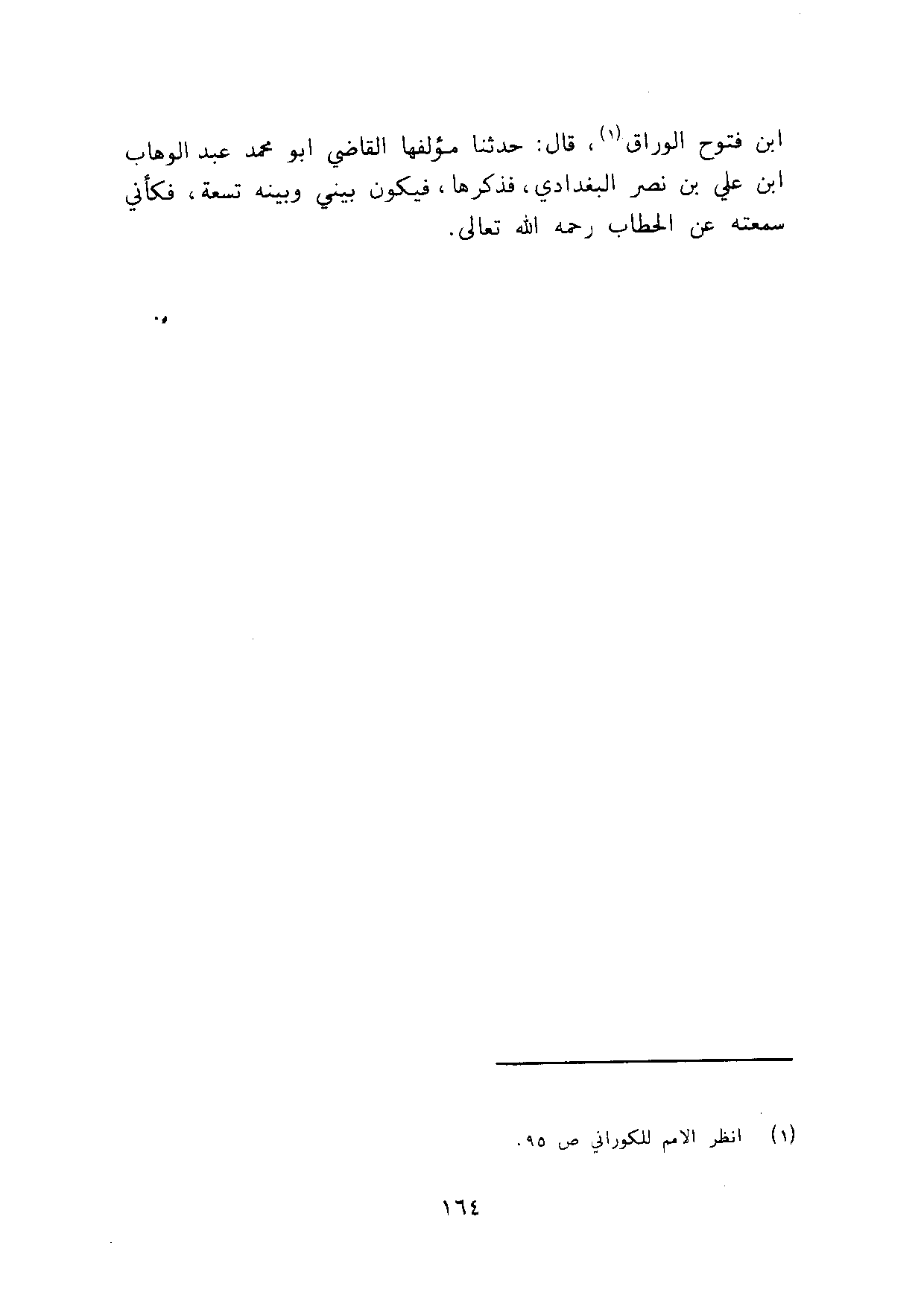 ابْن فتوح الْوراق قَالَ حَدثنَا مؤلفها القَاضِي ابو مُحَمَّد عبد الْوَهَّاب ابْن عَليّ بن نصر الْبَغْدَادِيّ فَذكرهَا فَيكون بيني وَبَينه تِسْعَة فَكَأَنِّي سمعته عَن الْحطاب رَحمَه الله تَعَالَى