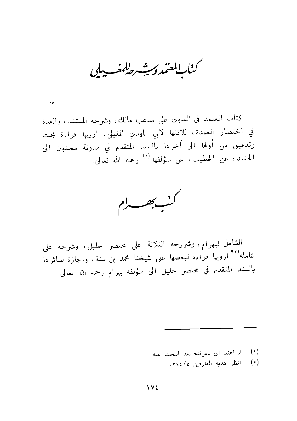 كتاب الْمُعْتَمد فِي الْفَتْوَى على مَذْهَب مَالك وَشَرحه الستند وَالْعدة فِي اخْتِصَار الْعُمْدَة ثلاثتها لابي الْمهْدي المغيلي ارويها قِرَاءَة بحث وتدقيق من أَولهَا الى آخرهَا بالسند الْمُتَقَدّم فِي مدونة سَحْنُون الى الْحَفِيد عَن الْخَطِيب عَن مؤلفها رَحْمَة الله تَعَالَى