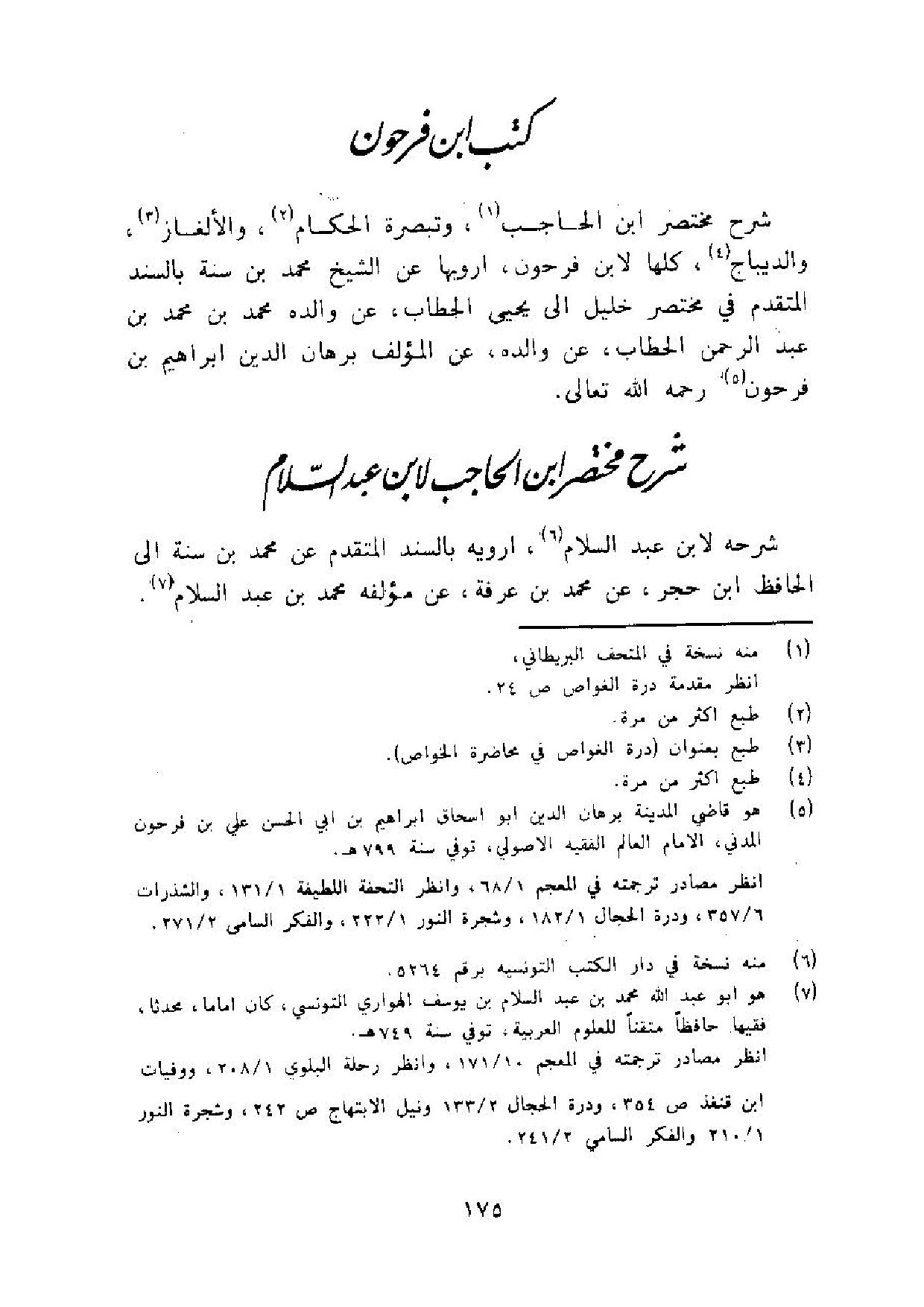 شرح مُخْتَصر ابْن الْحَاجِب وتبصرة الْحُكَّام والألغاز والديباج كلهَا لِابْنِ فَرِحُونَ ارويها عَن الشَّيْخ مُحَمَّد بن سنة بالسند الْمُتَقَدّم فِي مُخْتَصر خَلِيل الى يحيى الْحطاب عَن وَالِده مُحَمَّد بن مُحَمَّد بن عبد الرَّحْمَن الْحطاب عَن وَالِده عَن الْمُؤلف برهَان الدّين ابراهيم بن فَرِحُونَ رَحمَه الله تَعَالَى