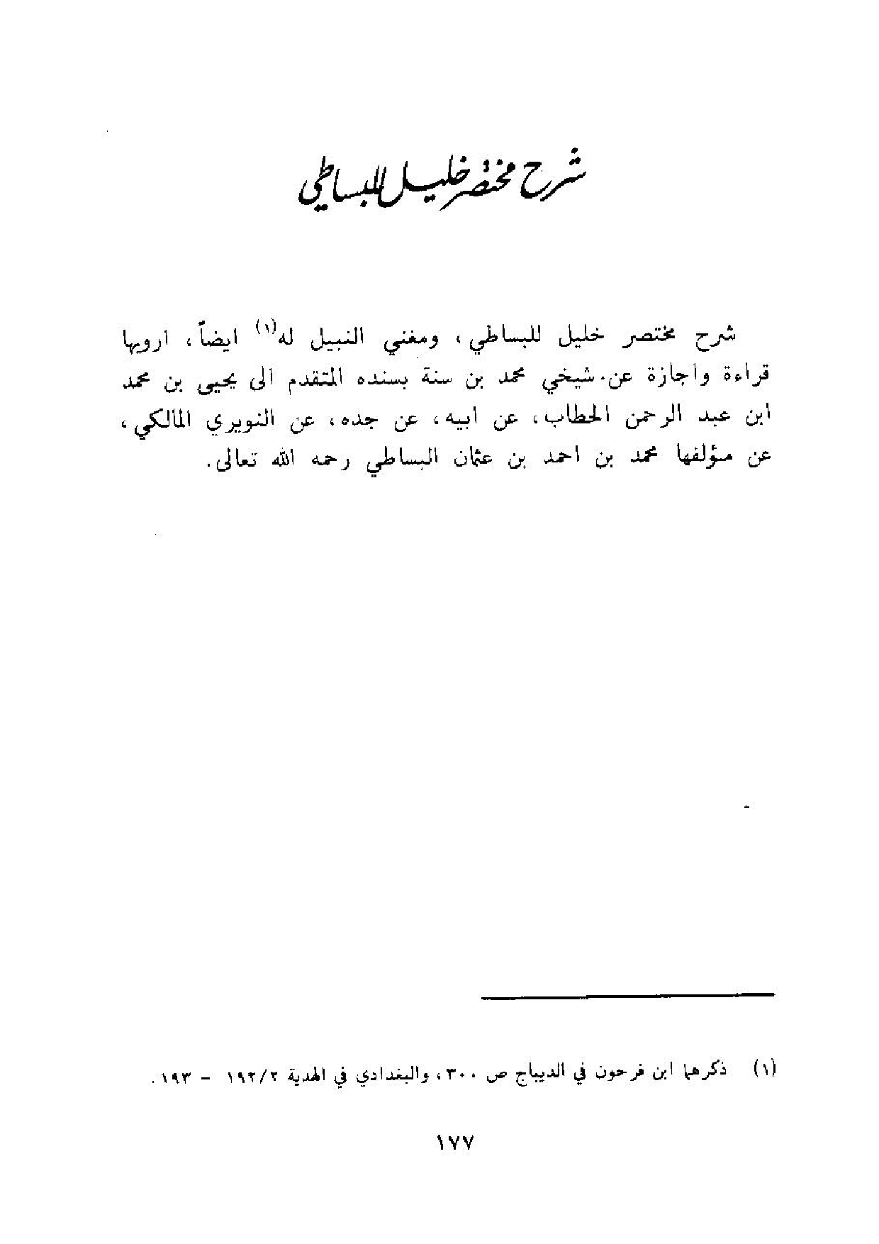 شرح مُخْتَصر خَلِيل للبساطي وَمُغْنِي النَّبِيل لَهُ ايضا ارويها قِرَاءَة واجازة عَن شَيْخي مُحَمَّد بن سنة بِسَنَدِهِ الْمُتَقَدّم الى يحيى بن مُحَمَّد ابْن عبد الرَّحْمَن الْحطاب عَن ابيه عَن جده عَن النويري الْمَالِكِي عَن مؤلفها مُحَمَّد بن احْمَد بن عُثْمَان الْبِسَاطِيّ رَحمَه الله تَعَالَى