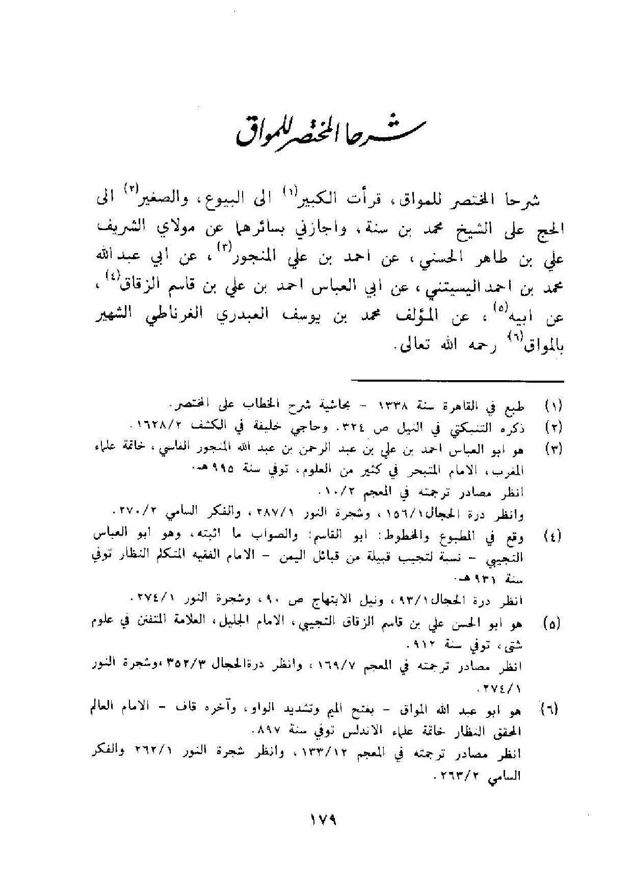 شرحا الْمُخْتَصر للمواق قَرَأت الْكَبِير الى الْبيُوع وَالصَّغِير الى الْحَج على الشَّيْخ مُحَمَّد بن سنة واجازني بسائرهما عَن مولَايَ الشريف عَليّ بن طَاهِر الحسني عَن احْمَد بن عَليّ المنجور عَن ابي عبد الله مُحَمَّد بن احْمَد اليسيتني عَن أبي الْعَبَّاس أَحْمد بن عَليّ بن قَاسم الزقاق عَن أَبِيه عَن الْمُؤلف مُحَمَّد بن يُوسُف الْعَبدَرِي الغرناطي الشهير بالمواق رَحمَه الله تَعَالَى